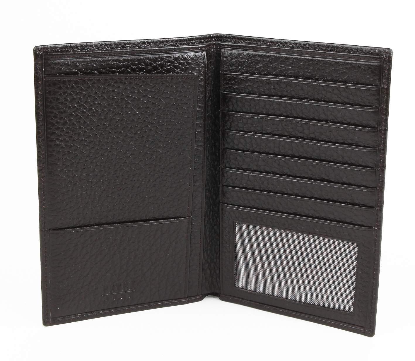 Бумажник путешественника из натуральной телячьей кожи. Внутри расположено место для паспорта, большой отдел для визитных и кредитных карт, одно отделение с прозрачным окошком, плюс один маленький карман и просторное отделение для наличных денег.