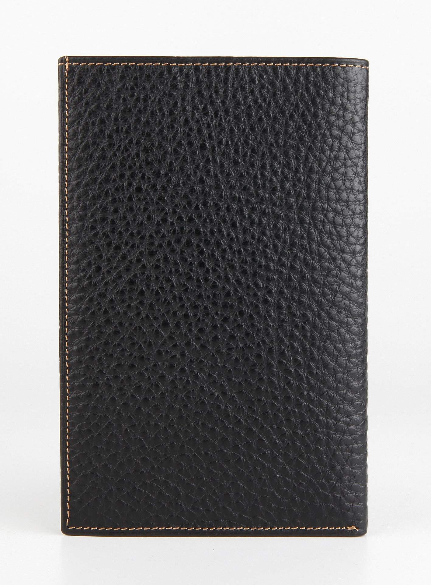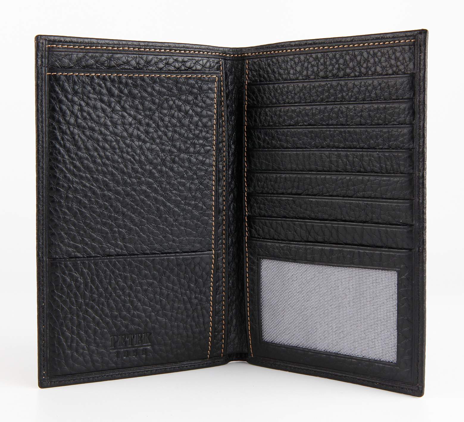 Бумажник путешественника из натуральной телячьей кожи. Внутри расположено место для паспорта, большой отдел для визитных и кредитных карт, одно отделение с прозрачным окошком, плюс один маленький карман и просторное отделение для наличных денег.