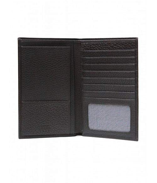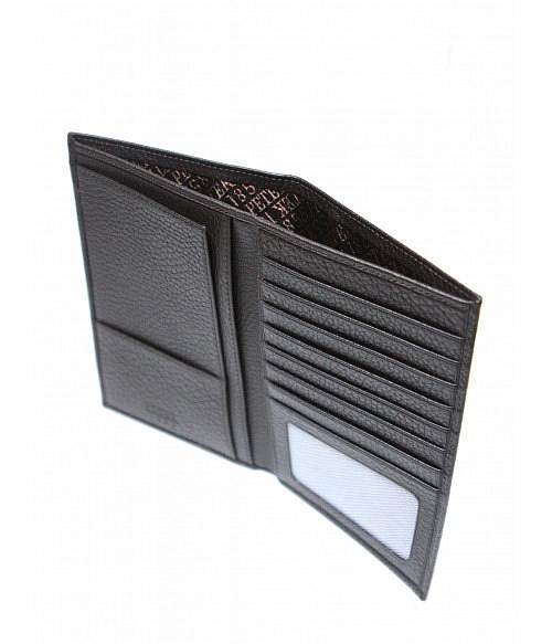 Бумажник путешественника из натуральной телячьей кожи. Внутри расположено место для паспорта, большой отдел для визитных и кредитных карт, одно отделение с прозрачным окошком, плюс один маленький карман и просторное отделение для наличных денег.