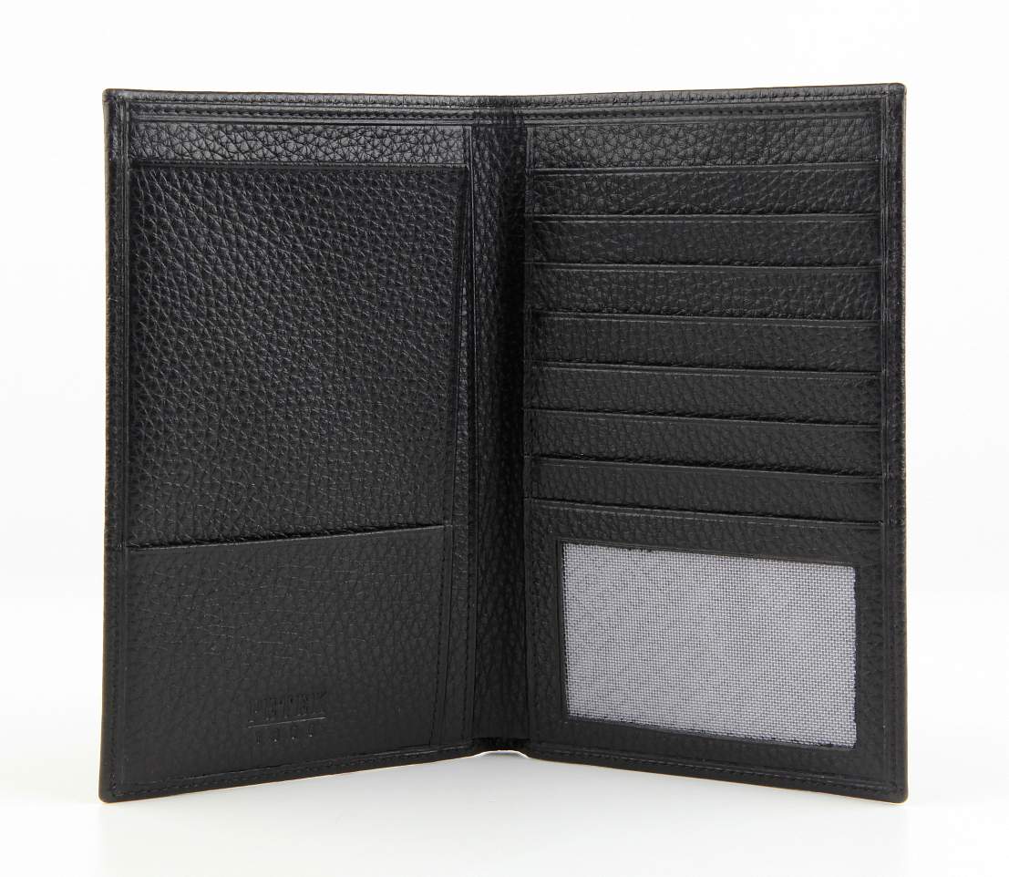 Бумажник путешественника из натуральной телячьей кожи. Внутри расположено место для паспорта, большой отдел для визитных и кредитных карт, одно отделение с прозрачным окошком, плюс один маленький карман и просторное отделение для наличных денег.