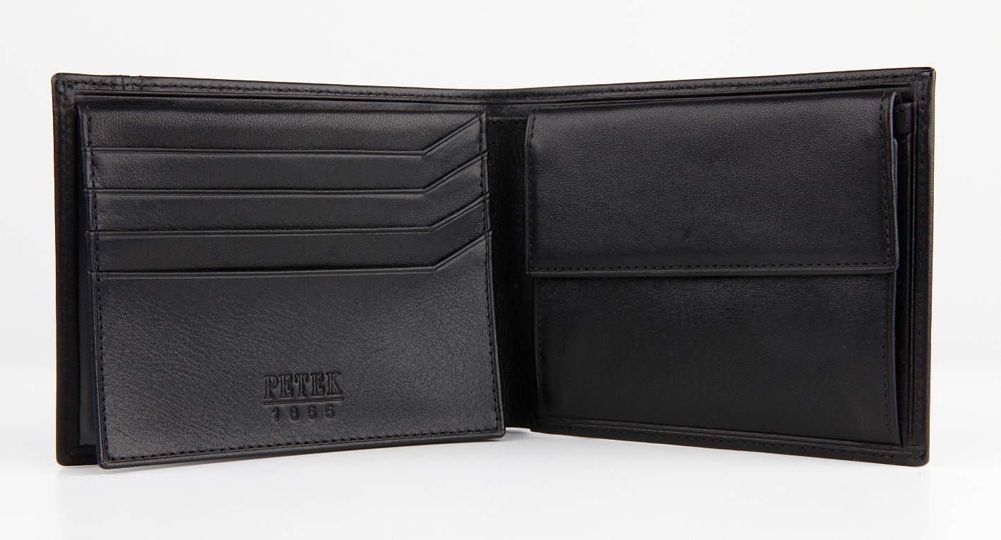 Элегантное стильное мужское портмоне Petek из натуральной кожи. Эта удобная и многофункциональная модель выполнена из натуральной кожи. Внутри: 2 отделения для купюр, 6 карманов для кредитных карт, отделение для мелочи.