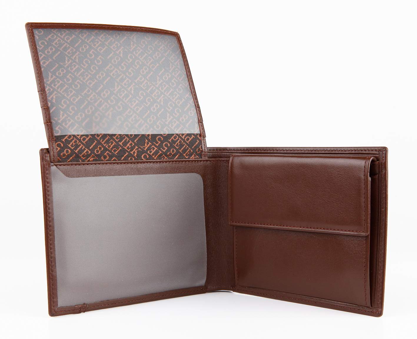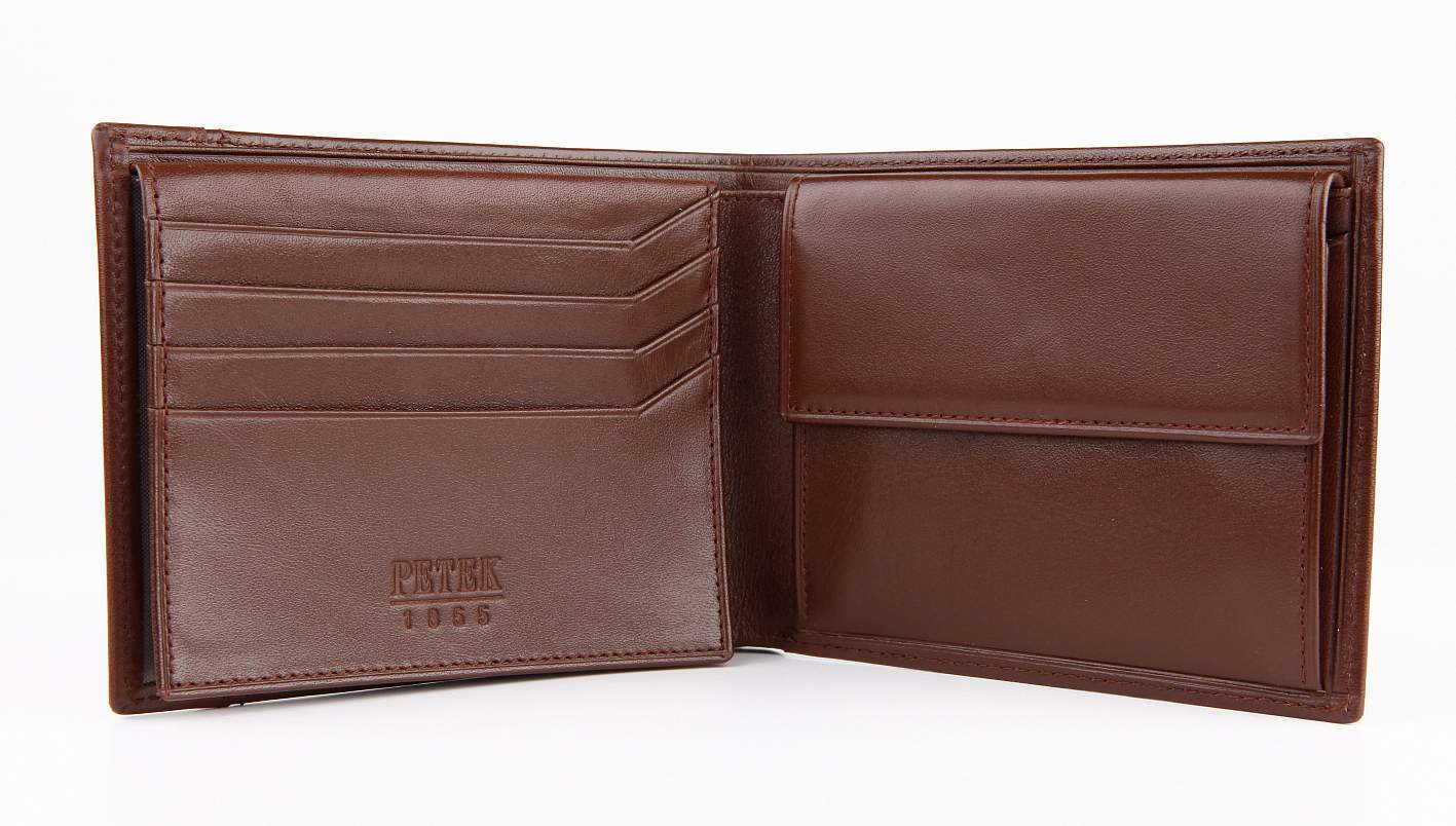 Элегантное стильное мужское портмоне Petek из натуральной кожи. Эта удобная и многофункциональная модель выполнена из натуральной кожи. Внутри: 2 отделения для купюр, 6 карманов для кредитных карт, отделение для мелочи.