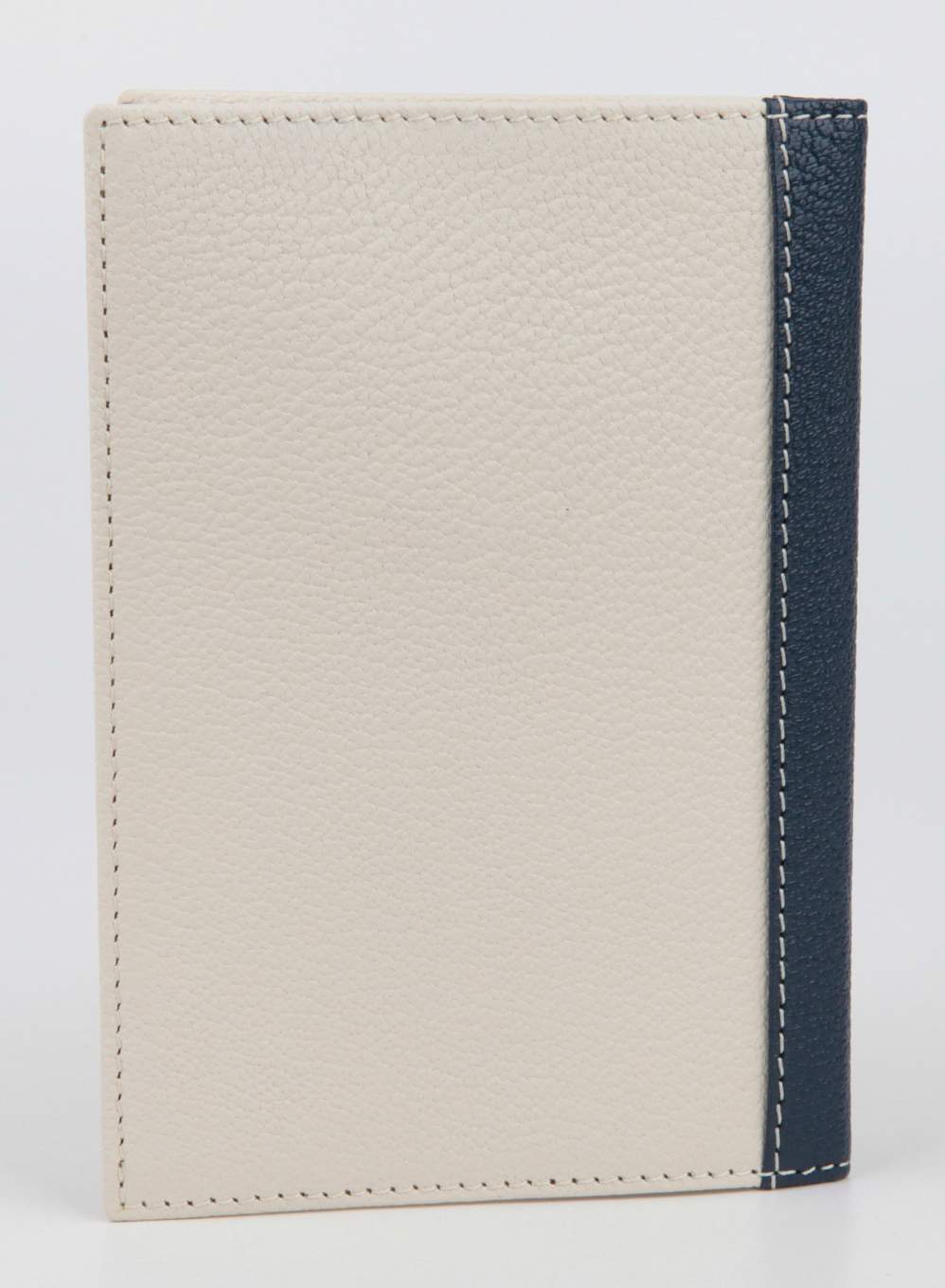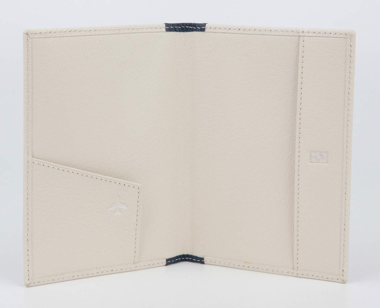 Обложка для биометрического паспорта из новой коллекции Petek1855 в комбинированной коже из двух цветов, бежевого и синего. Внутри имеется открытый кармашек для посадочного талона.