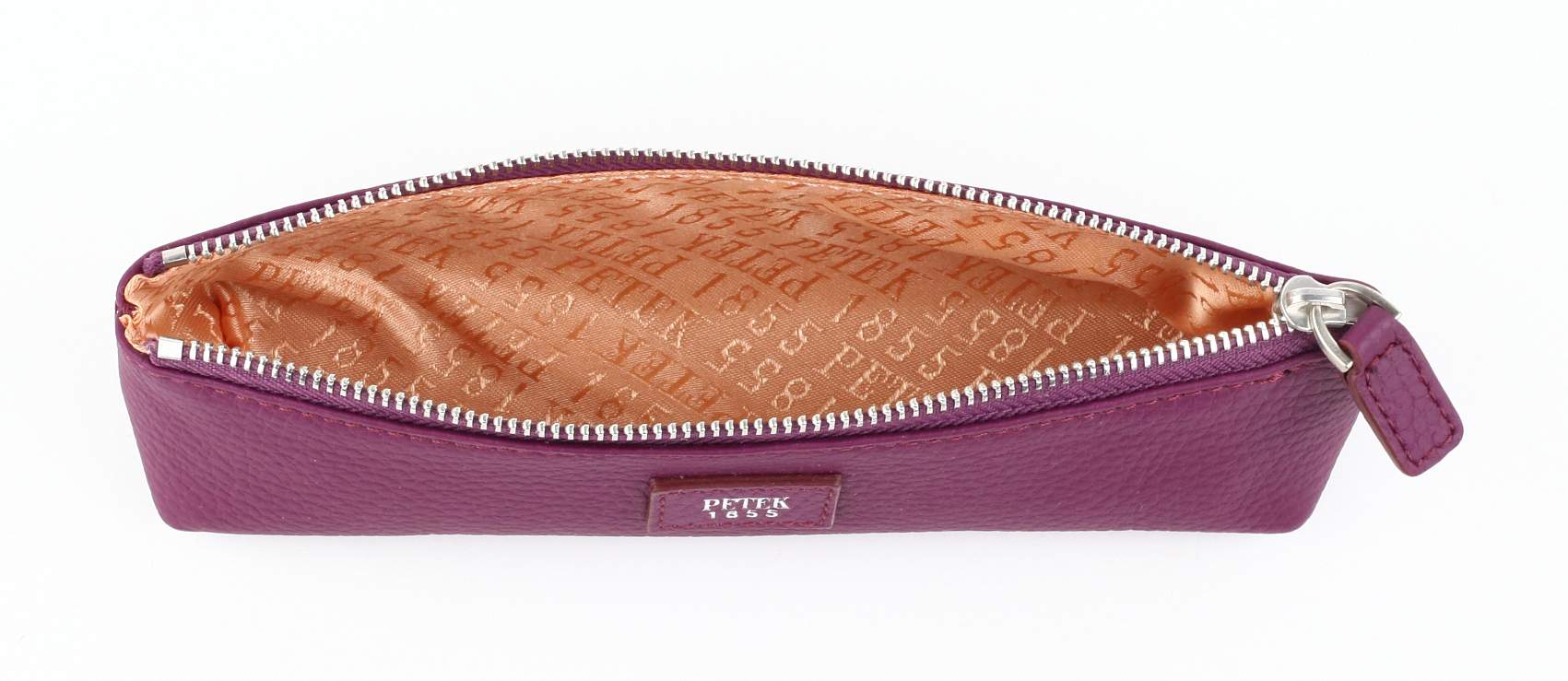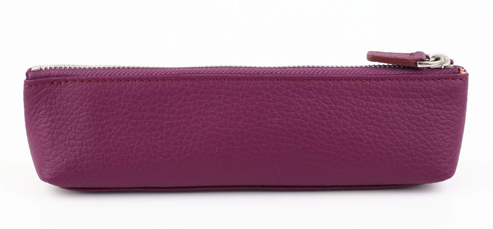 Кожаный футляр для косметики из натуральной кожи. Одно отделение, вместимость более 10 предметов. Имеет треугольную форму. Закрывается на молнию