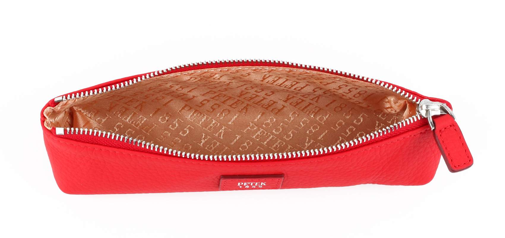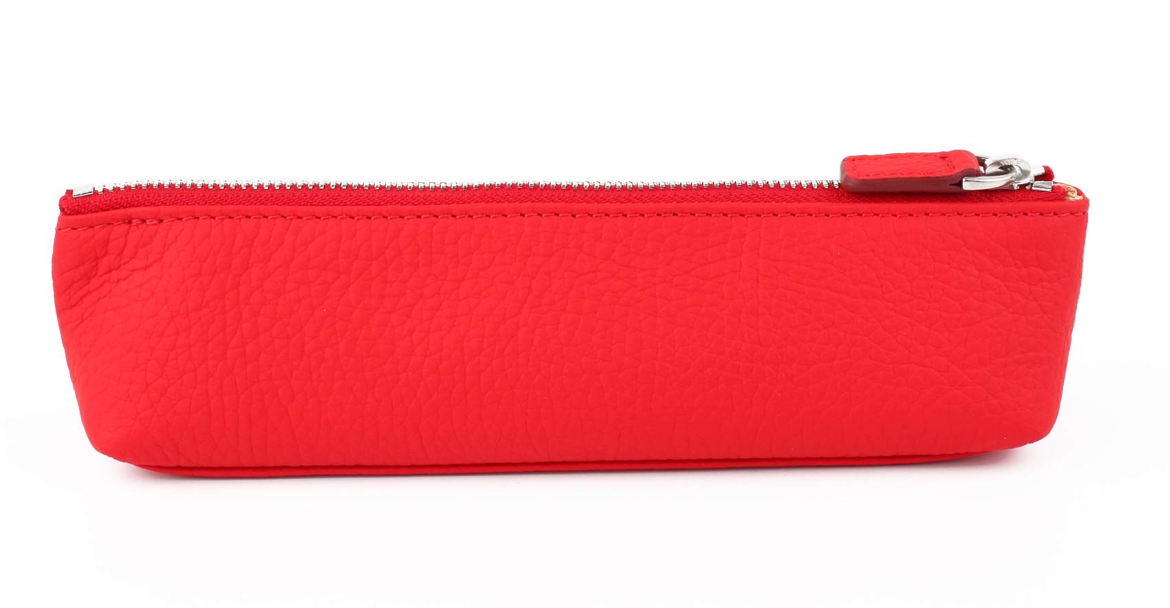 Кожаный футляр для косметики из натуральной кожи. Одно отделение, вместимость более 10 предметов. Имеет треугольную форму. Закрывается на молнию