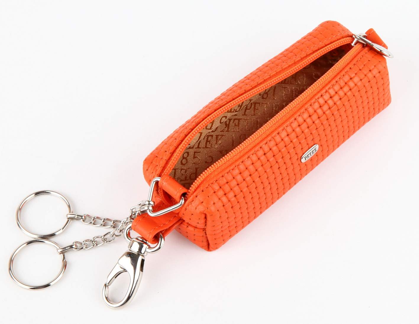 Ключница из натуральной кожи Petek обеспечивает безопасное и удобное хранение ваших ключей. Она закрывается на молнию, а внутри ключницы расположены два металлических кольца для ключей на цепочках. Снаружи ключницы, на одной из ее боковых сторон, имеется карабин для удобного ношения на поясе. Этот стильный и функциональный аксессуар позволит вам всегда иметь доступ к своим ключам и при этом сохранять их в безопасности.