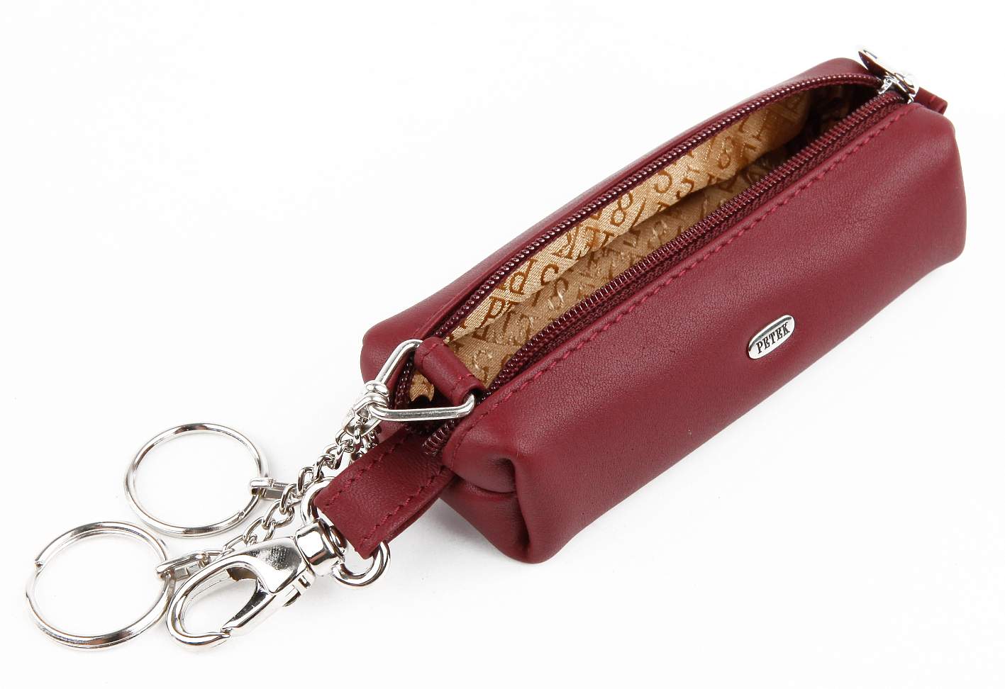 Ключница из натуральной кожи Petek обеспечивает безопасное и удобное хранение ваших ключей. Она закрывается на молнию, а внутри ключницы расположены два металлических кольца для ключей на цепочках. Снаружи ключницы, на одной из ее боковых сторон, имеется карабин для удобного ношения на поясе. Этот стильный и функциональный аксессуар позволит вам всегда иметь доступ к своим ключам и при этом сохранять их в безопасности.