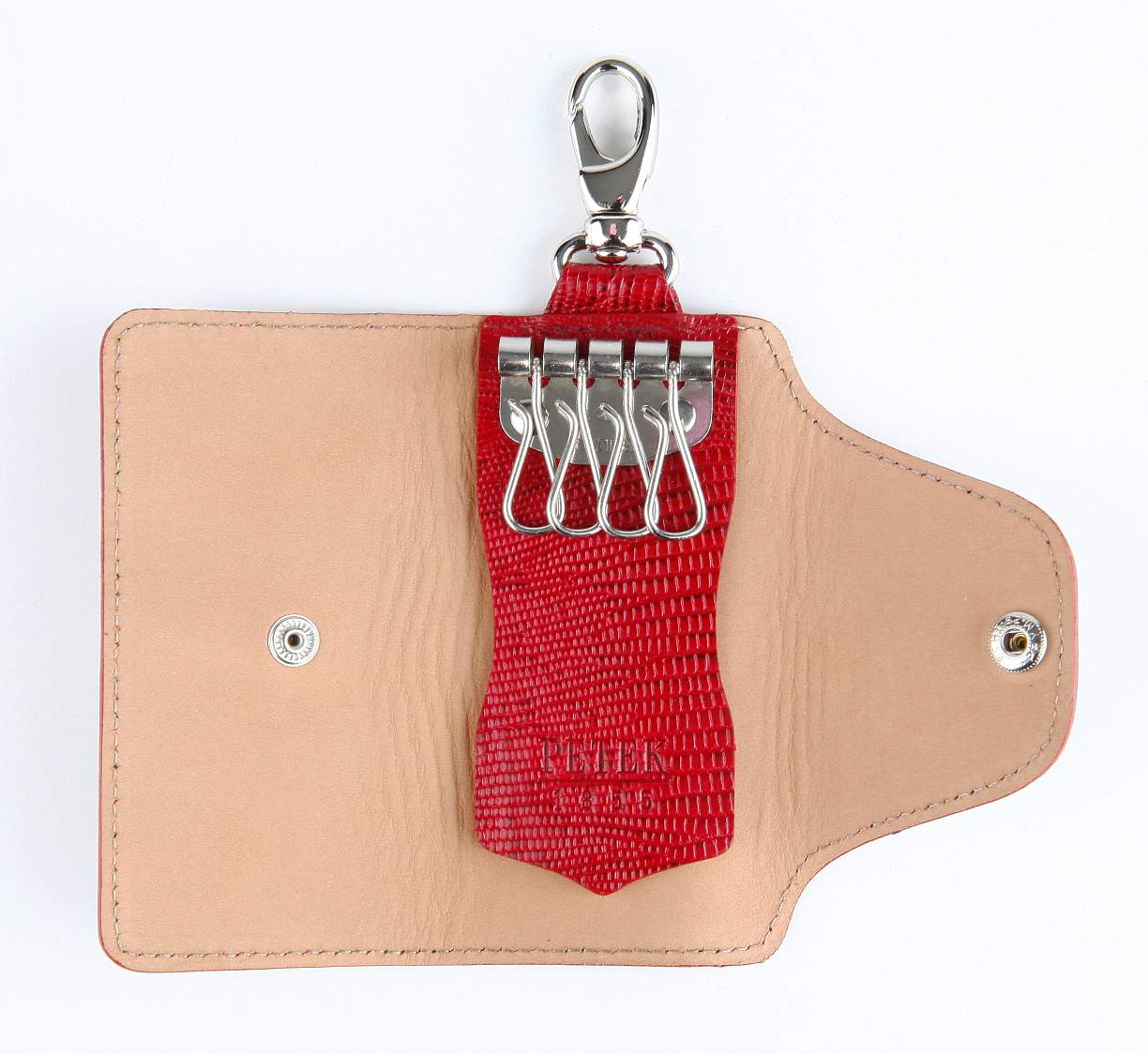 Стильная кожаная ключница Petek. Застегивается на кнопку, четыре держателя для ключей, а также крепление в виде карабина.