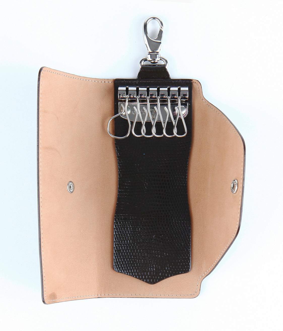 Вместительная ключница из качественной натуральной кожи. Застегивается на кнопку, шесть держателей для ключей, а также крепление в виде карабина.