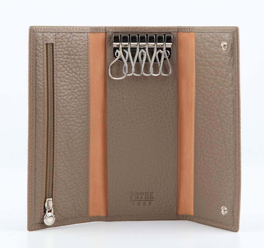 Стильный кожаный футляр на 6 ключей, внутри небольшое отделение на молнии. Закрывается на 2 кнопки.