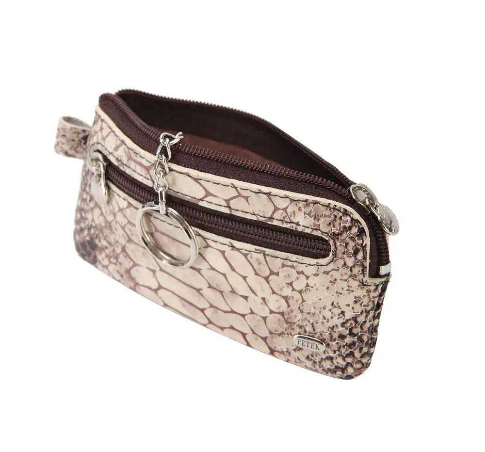 Ключница Petek изготовлена из натуральной кожи и закрывается на молнию. Внутри главного отделения расположен карабин для ключей, который обеспечивает надежное хранение ключей. Дополнительно ключница имеет два отделения на молнии для различных мелочей. Глубина бокового кармашка составляет 4 см, включая молнию, что позволяет хранить в нем небольшие предметы. В целом, ключница является удобным и стильным аксессуаром для хранения ключей и различных мелочей.