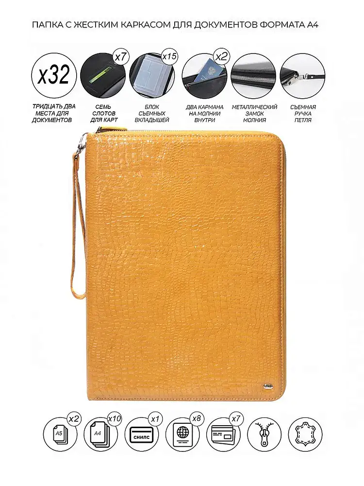 Эта папка оснащена 32 отделениями, включая 4 отделения под паспорт, 6 отделений для пластиковых карт, 2 отделения на молнии и 1 отделение для Снилс. Внутри папки также имеется вкладыш, который позволяет организовать хранение документов наиболее удобным образом.