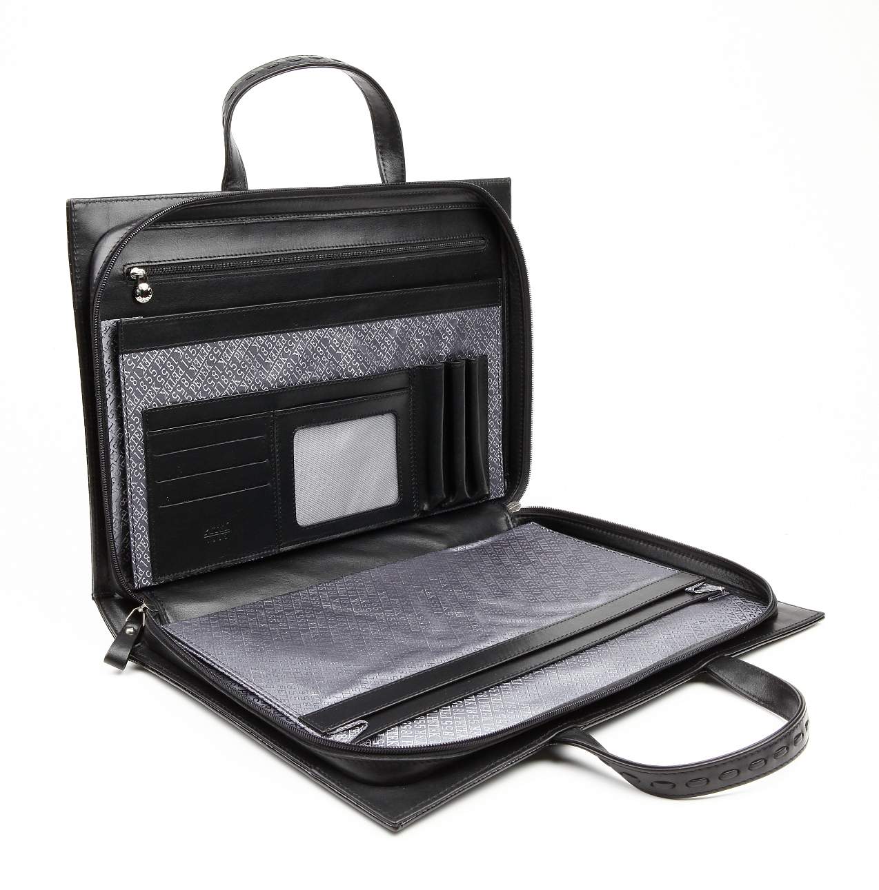 Оригинальная и стильная модель из шикарной кожи, сконструированная по принципу папки на двух ручках. Внутри, тем не менее, имеются все необходимые отделения: два основных для бумаг и документов, бизнес-блок, состоящий из отделения на молнии, держателя для ручек, дополнительного кармана, четырех прорезных карманов для визитных карточек и прозрачного кармана с сеткой. Молния закрывает портфель по периметру, что дает дополнительные возможности для быстрого поиска нужной вещи. Предусмотрен большой карман на змейке. На внешней поверхности портфеля и на ручках – декоративная отделка из кожи