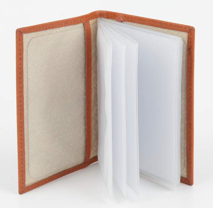 Закрывается без застежки. 8 двухсторонних отделений для визитных и кредитных карт.