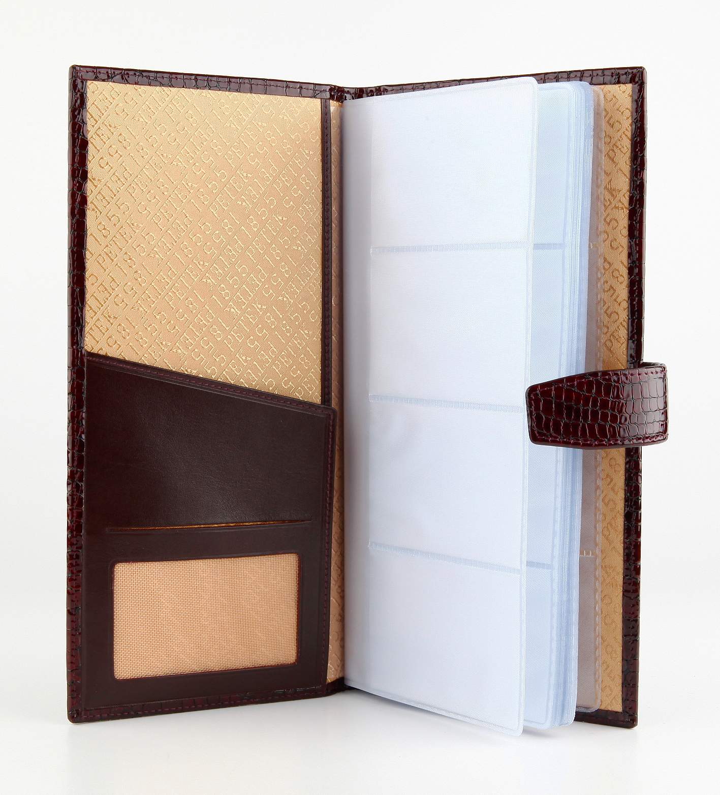 Настольная визитница из натуральной кожи высокого качества. Внутри имеется блок для визиток из 20 плотных пластиковых файлов по 4 отделения. Блок легко вынимается из кожаной обложки. При двустороннем размещении в визитницу помещается 160 карточек. На кожаной обложке внутри имеется дополнительный кармашек и уголок для бумаг.