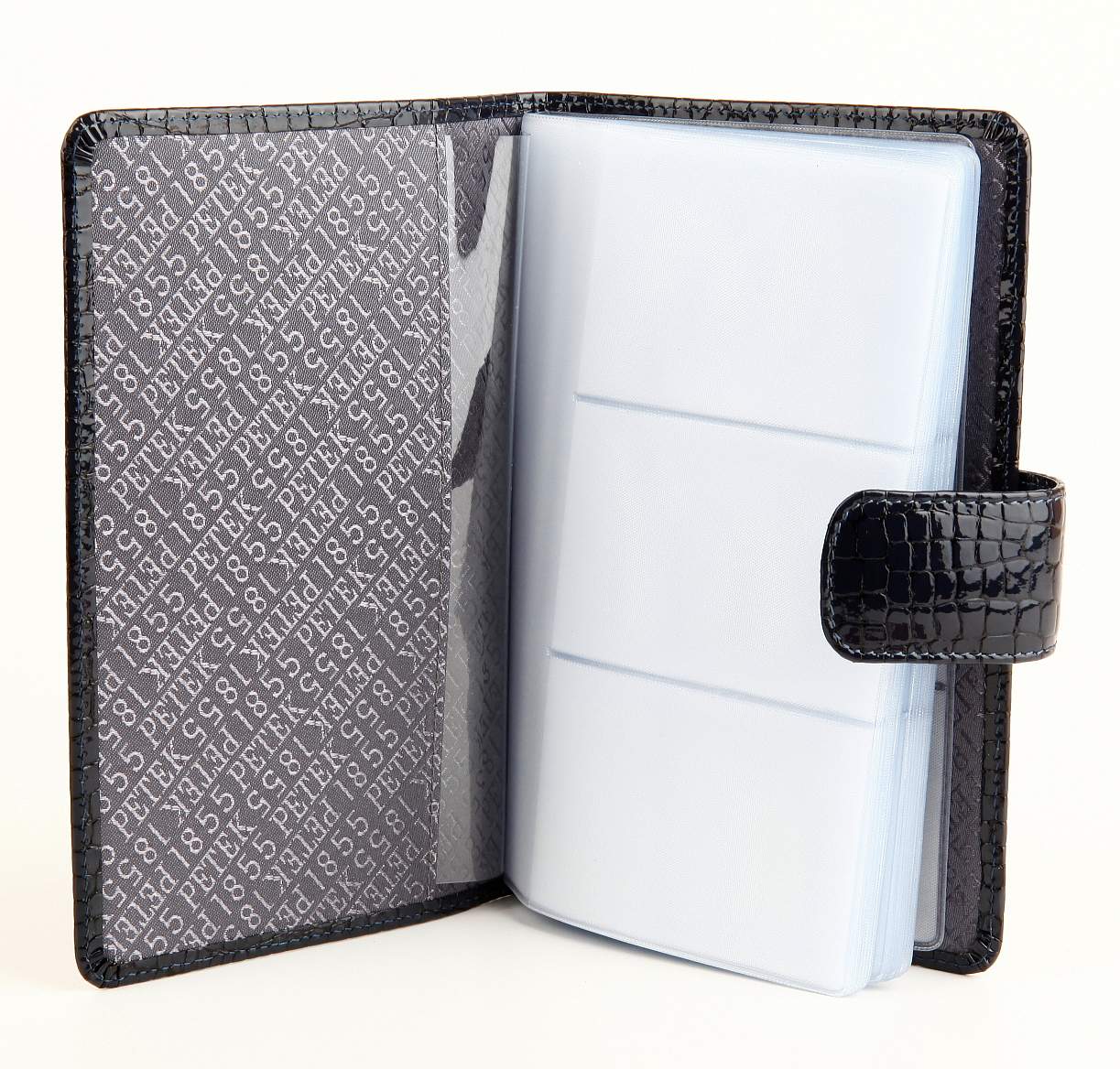Стильная классическая визитница из натуральной кожи, застегивается на кнопку. Внутри имеются двадцать файлов из прочного пластика. В каждом файле помещается по 3 визитные карточки с одной стороны. Максимальное количество визиток - 120