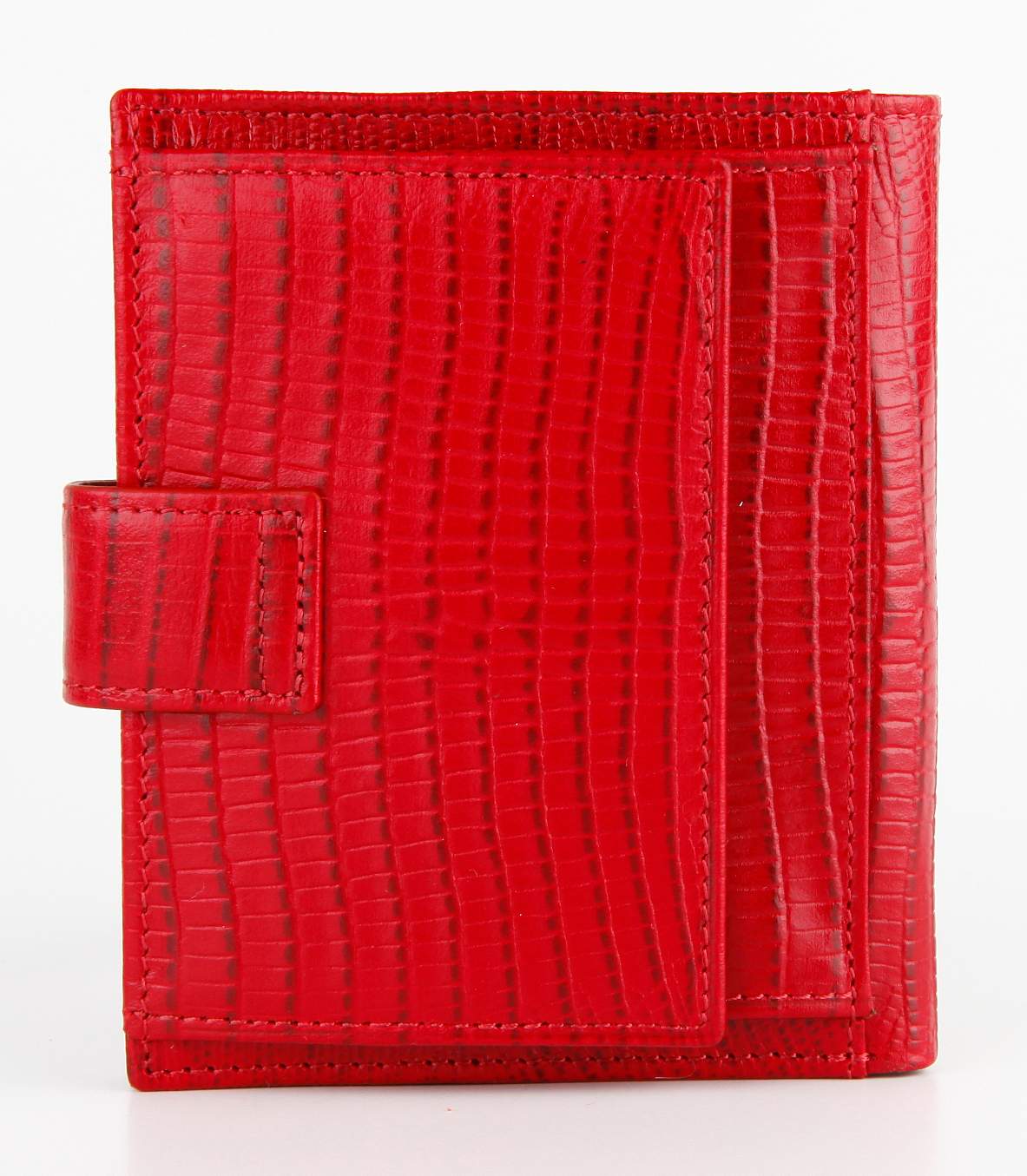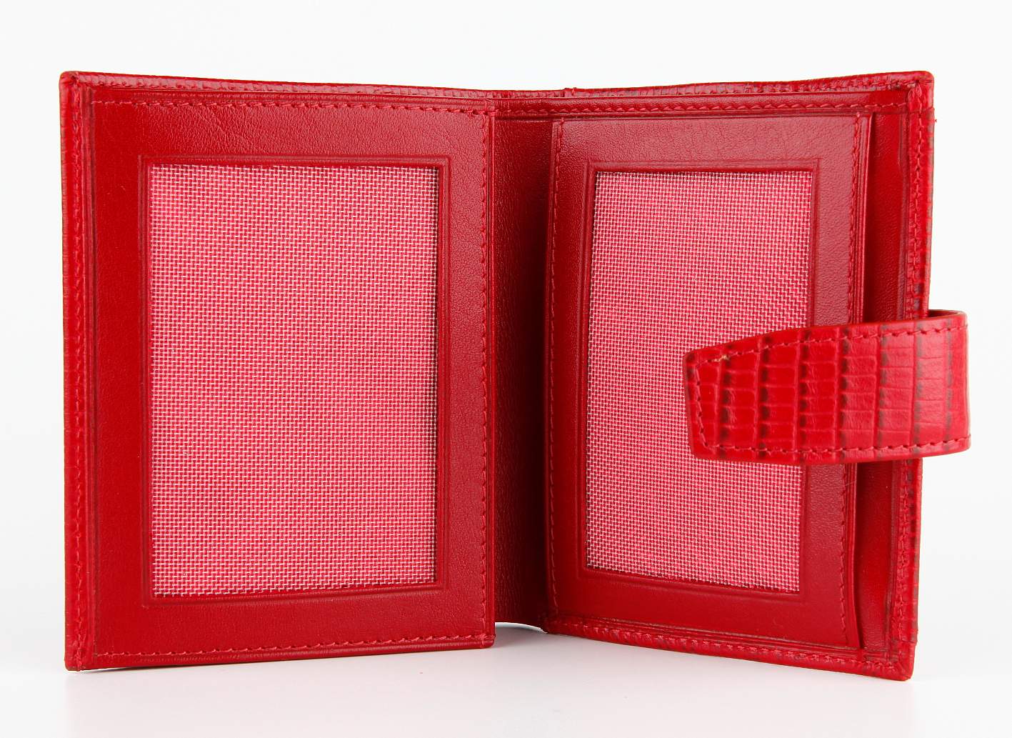 Портмоне из натуральной кожи. Удобная современная модель. Закрывается на хлястик, раскладывается пополам. Внутри: отделение для купюр, пять отделений для пластиковых карт, два прозрачных отделения. С обратной стороны монетница на кнопке.