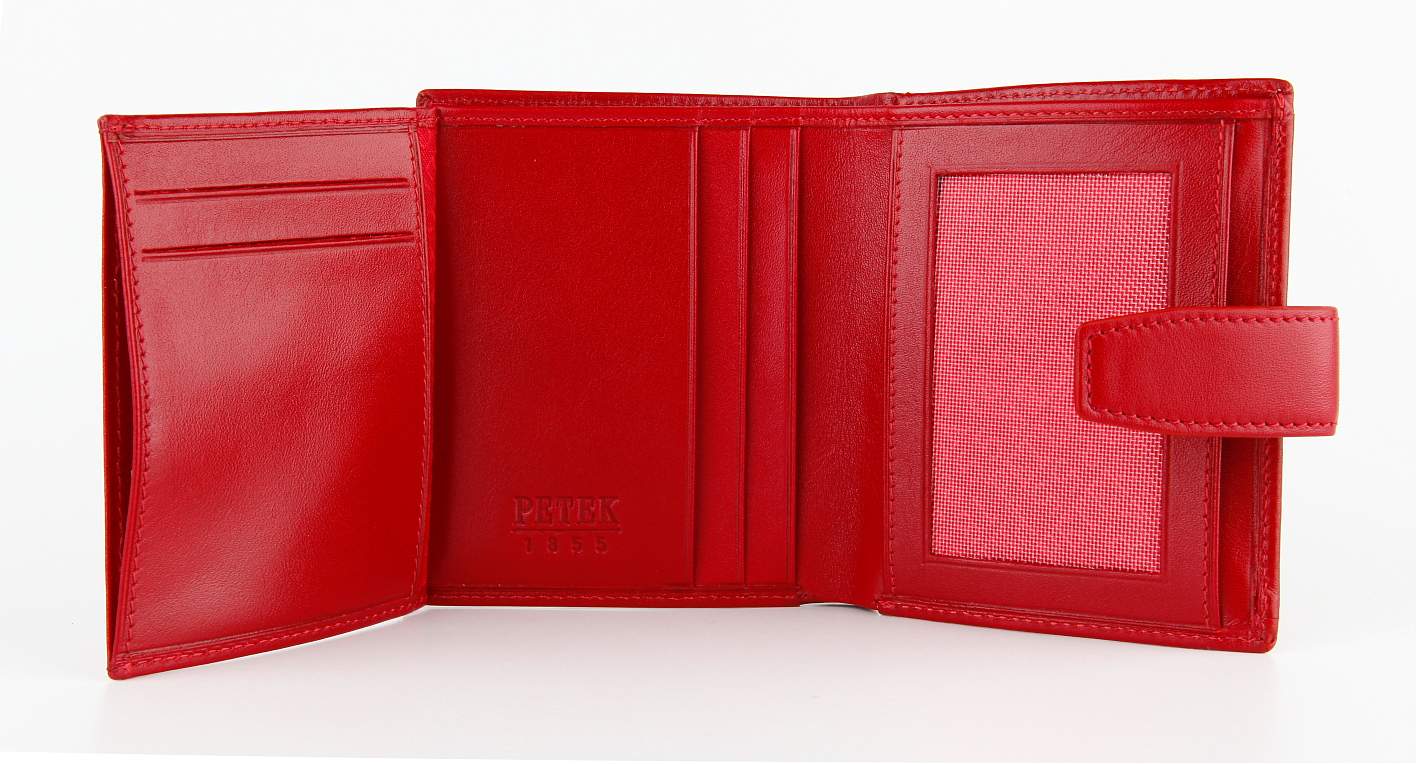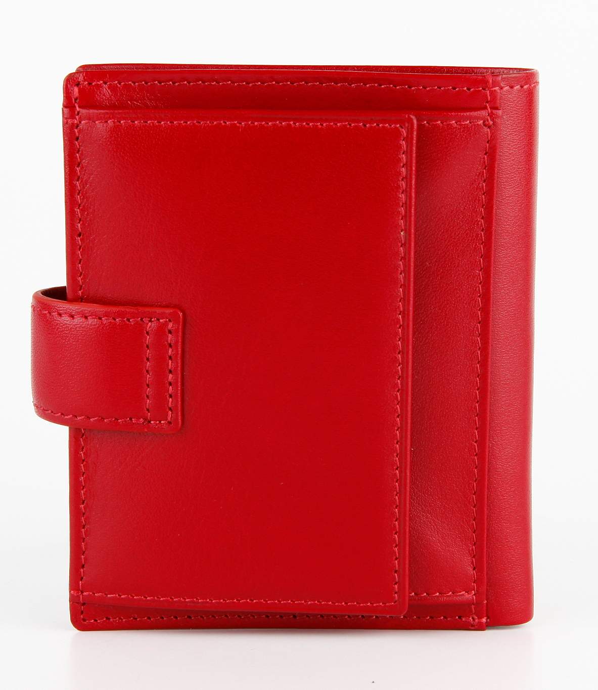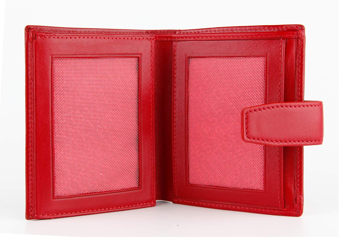Портмоне из натуральной кожи. Удобная современная модель. Закрывается на хлястик, раскладывается пополам. Внутри: отделение для купюр, пять отделений для пластиковых карт, два прозрачных отделения. С обратной стороны монетница на кнопке.