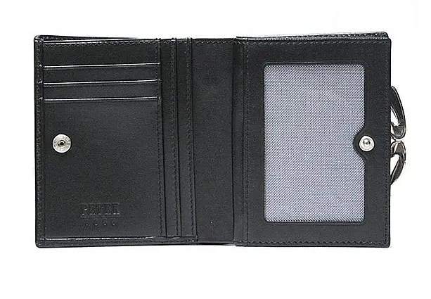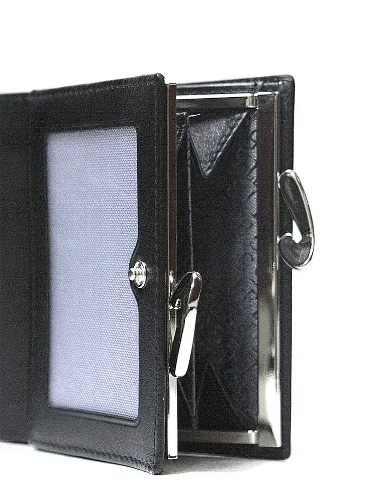 Кошелек. Раскладывается пополам, закрывается на кнопку, внутри: два больших отдела для купюр, отделение для мелочи с классическим зажимом (внутри - два отдела), три отделений для карт, три потайных кармана для документов.