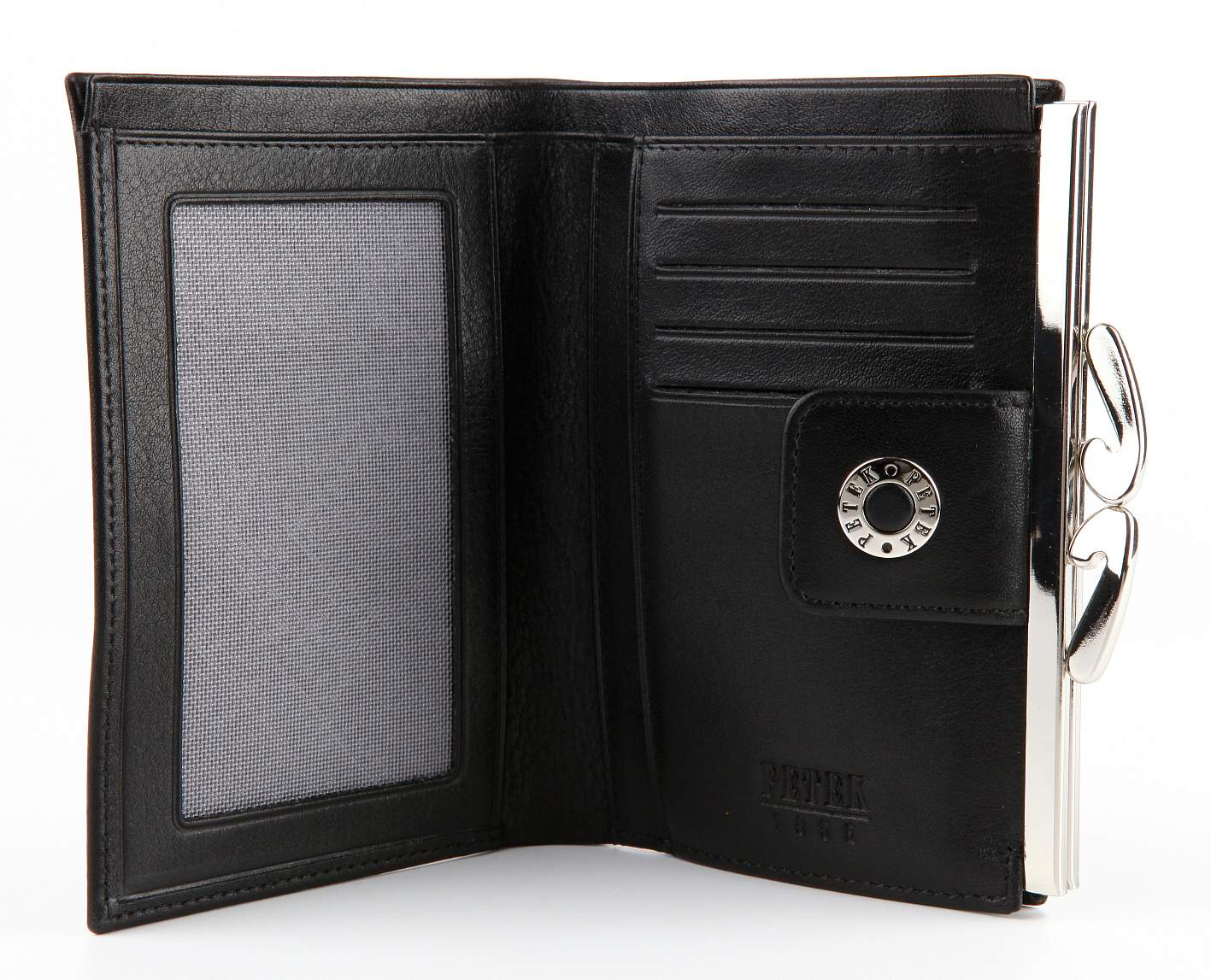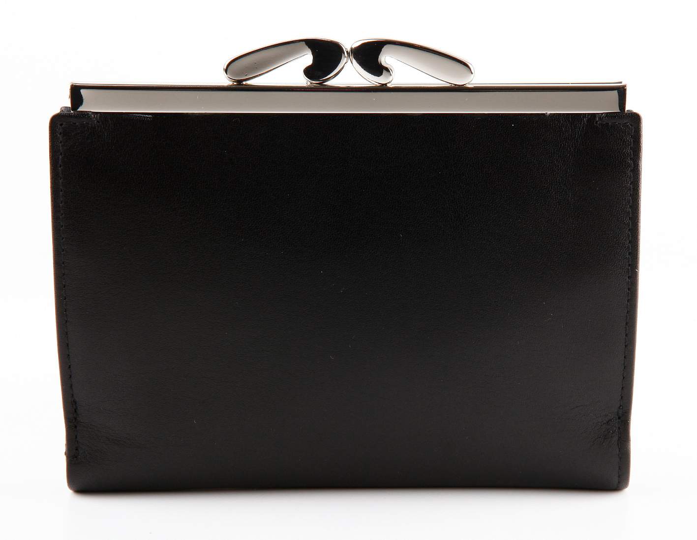 Кошелек. Раскладывается пополам, закрывается клапаном с кнопкой. Снаружи на задней стенке большая монетница из двух отделов (закрывается декоративным металлическим зажимом). Внутри: два отдела для купюр, два кармана для документов, 4 отделения для карт.