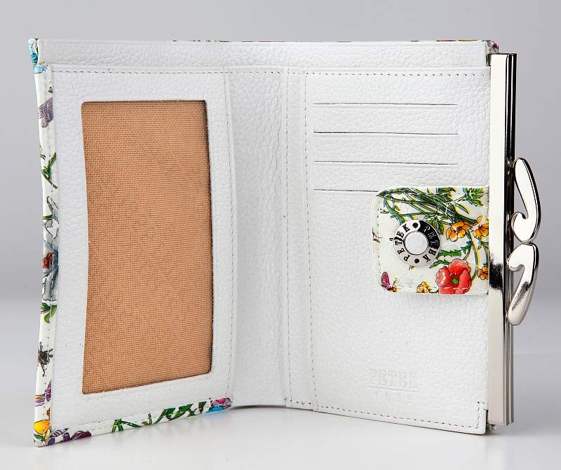 Кошелек. Раскладывается пополам, закрывается клапаном с кнопкой. Снаружи на задней стенке большая монетница из трех отделов (закрывается декоративным металлическим зажимом). Внутри: два отдела для купюр, два кармана для документов.
