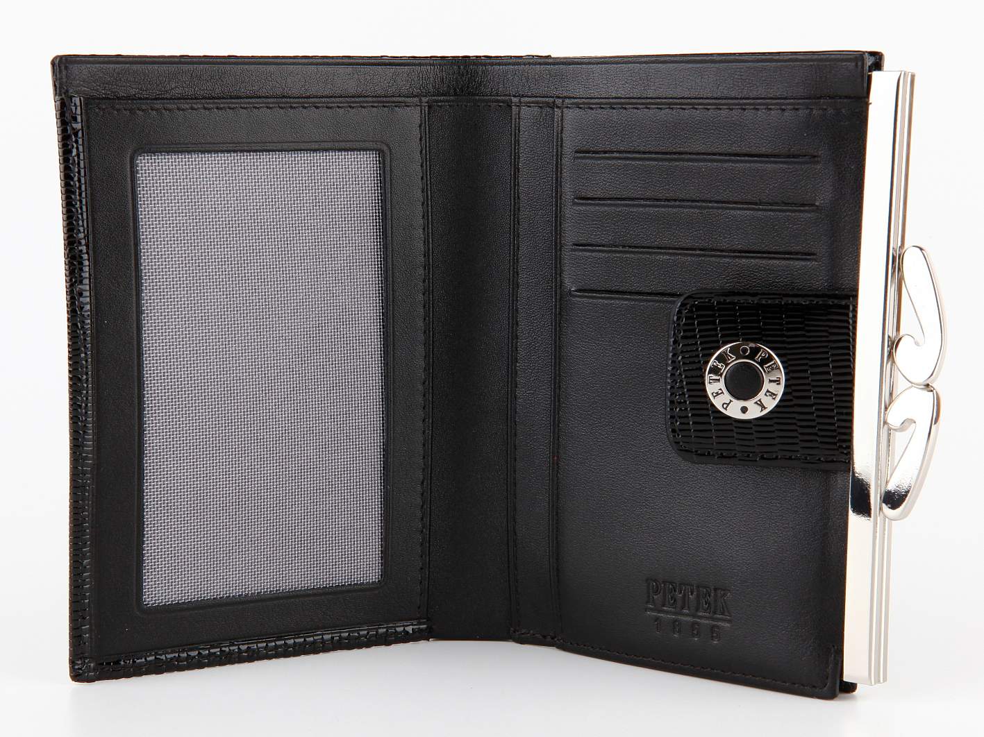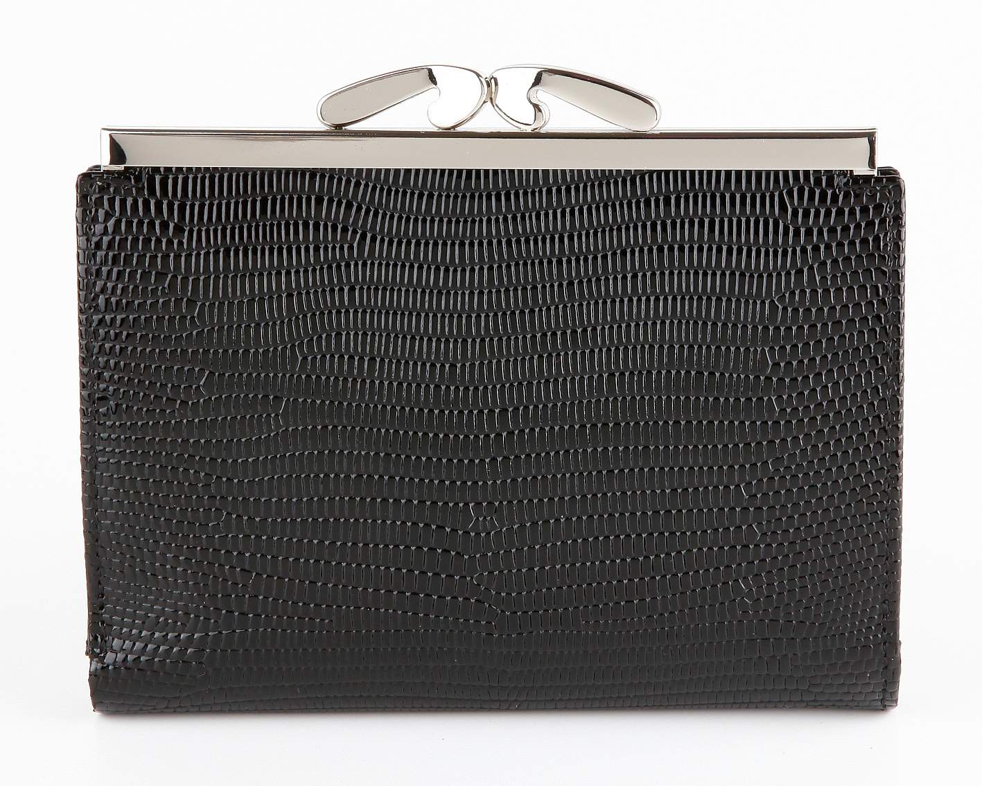 Кошелек. Раскладывается пополам, закрывается клапаном с кнопкой. Снаружи на задней стенке большая монетница из трех отделов (закрывается декоративным металлическим зажимом). Внутри: два отдела для купюр, два кармана для документов.