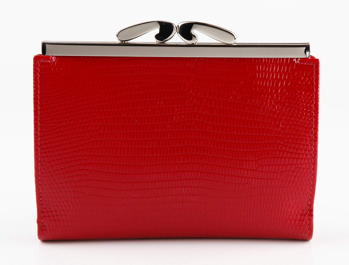 Кошелек. Раскладывается пополам, закрывается клапаном с кнопкой. Снаружи на задней стенке большая монетница из трех отделов (закрывается декоративным металлическим зажимом). Внутри: два отдела для купюр, два кармана для документов.