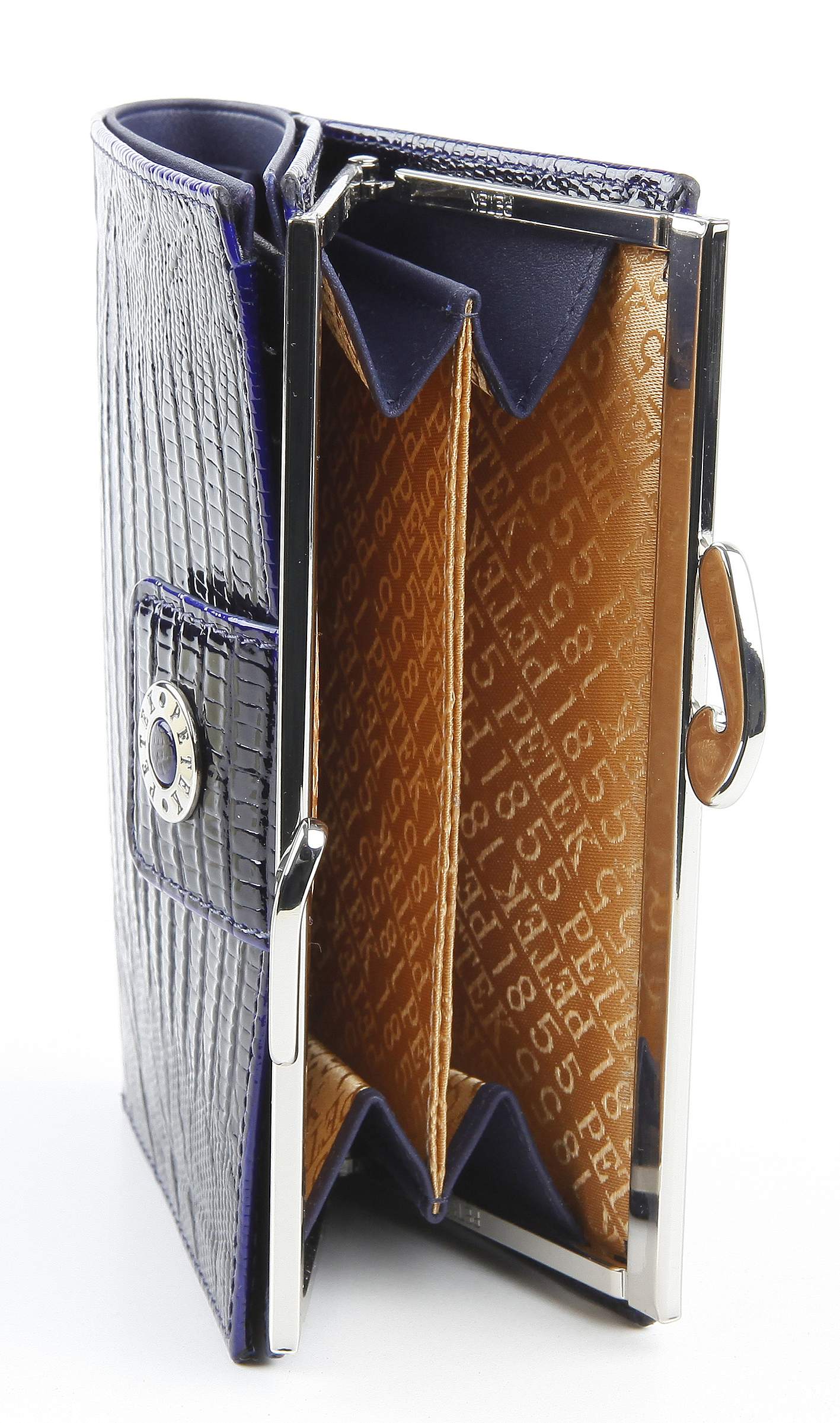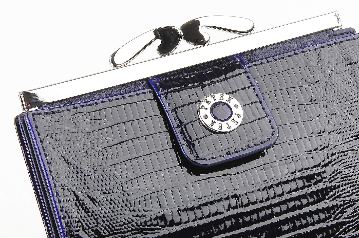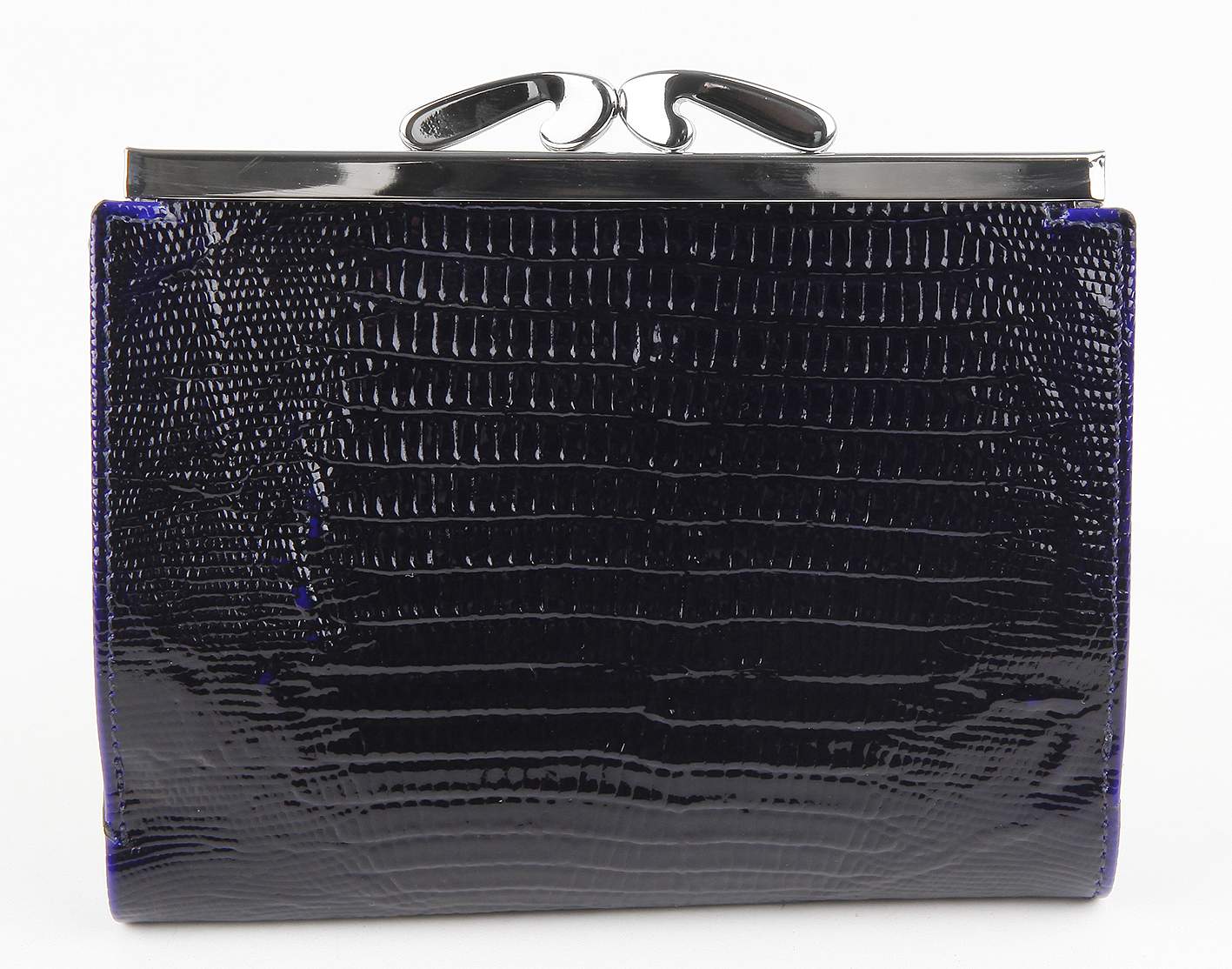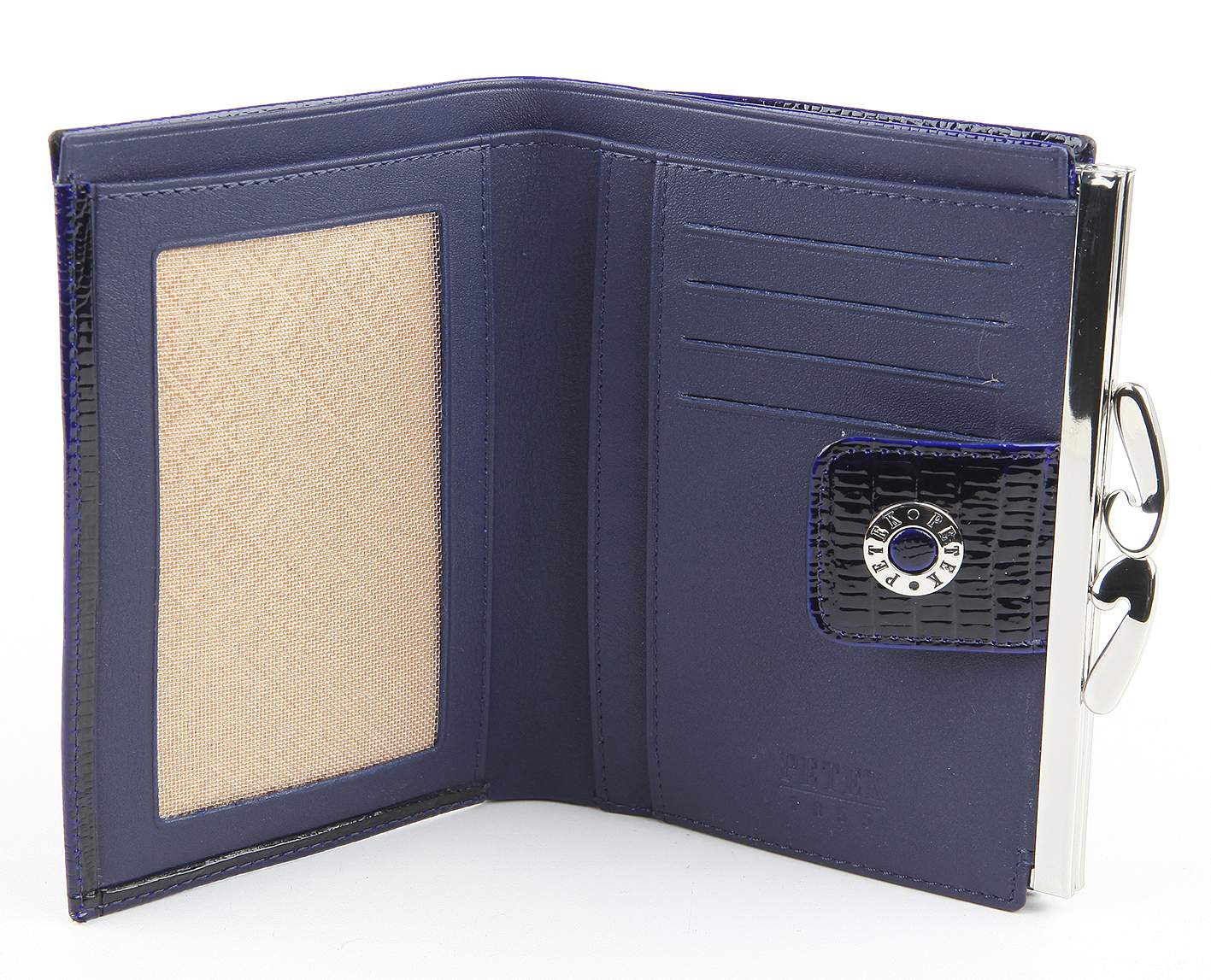 Кошелек. Раскладывается пополам, закрывается клапаном с кнопкой. Снаружи на задней стенке большая монетница из трех отделов (закрывается декоративным металлическим зажимом). Внутри: два отдела для купюр, два кармана для документов.