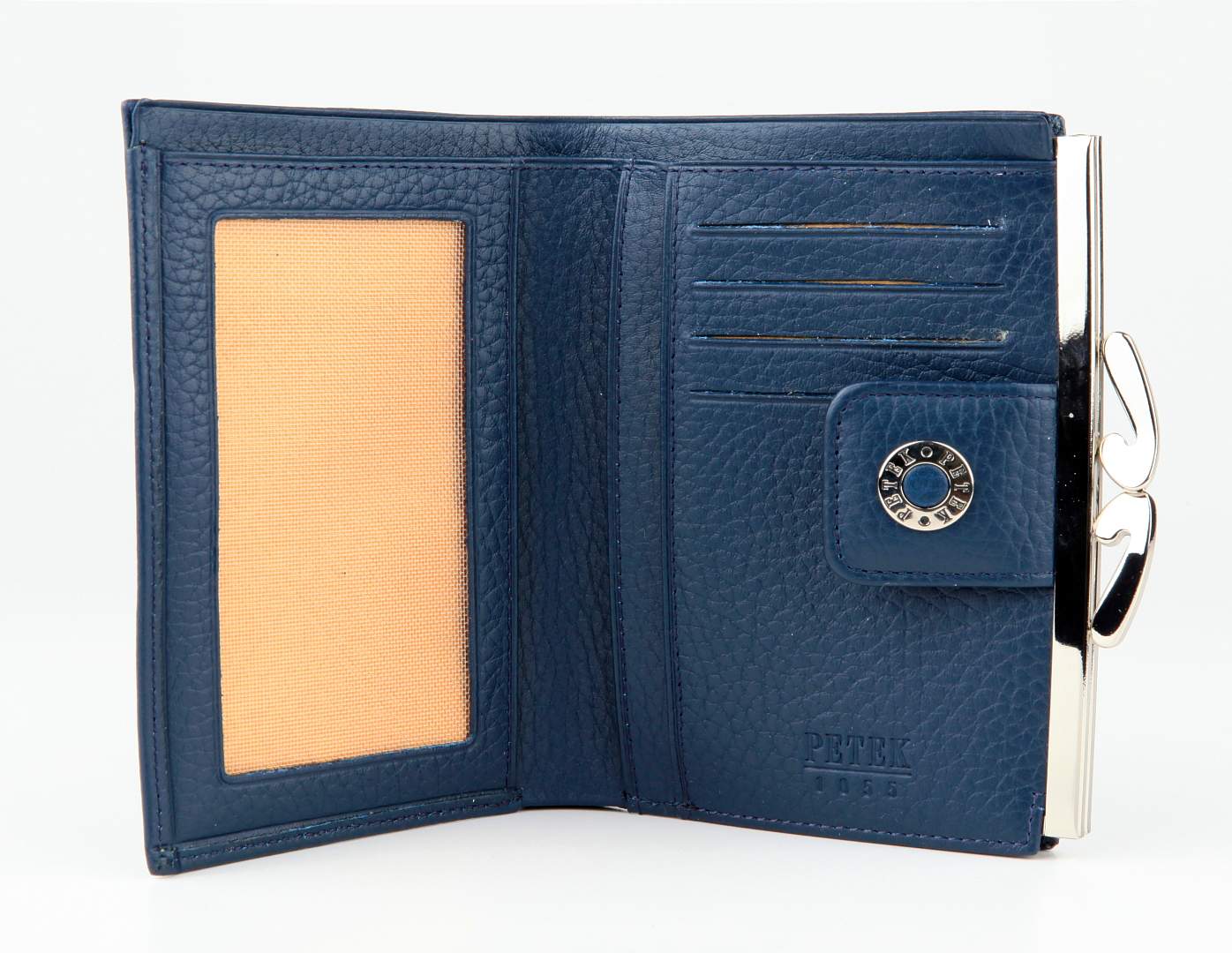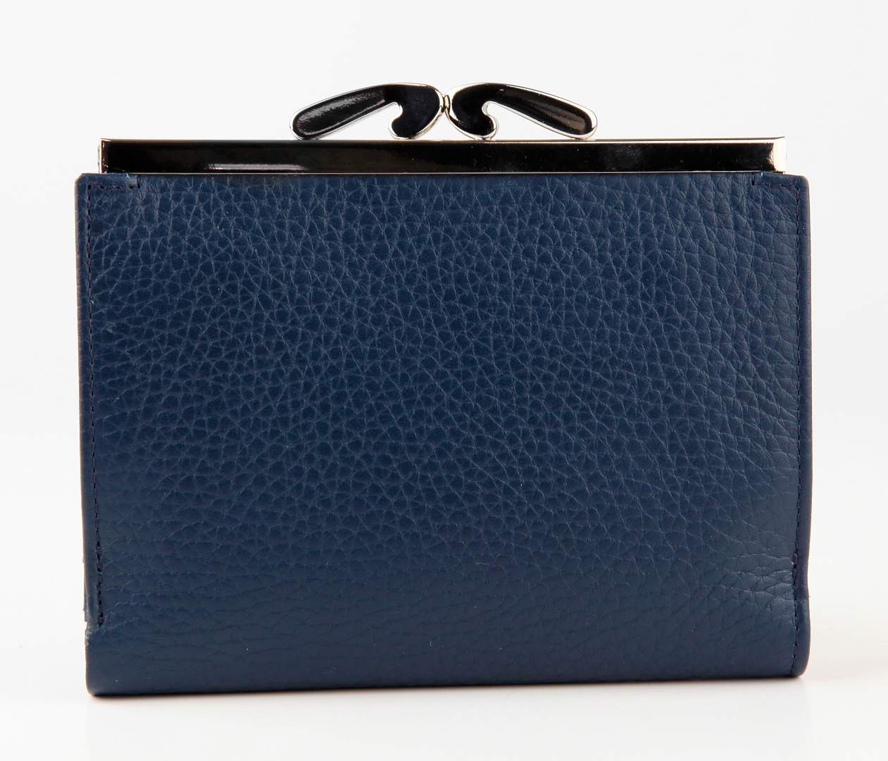 Кошелек. Раскладывается пополам, закрывается клапаном с кнопкой. Снаружи на задней стенке большая монетница из трех отделов (закрывается декоративным металлическим зажимом). Внутри: два отдела для купюр, два кармана для документов.