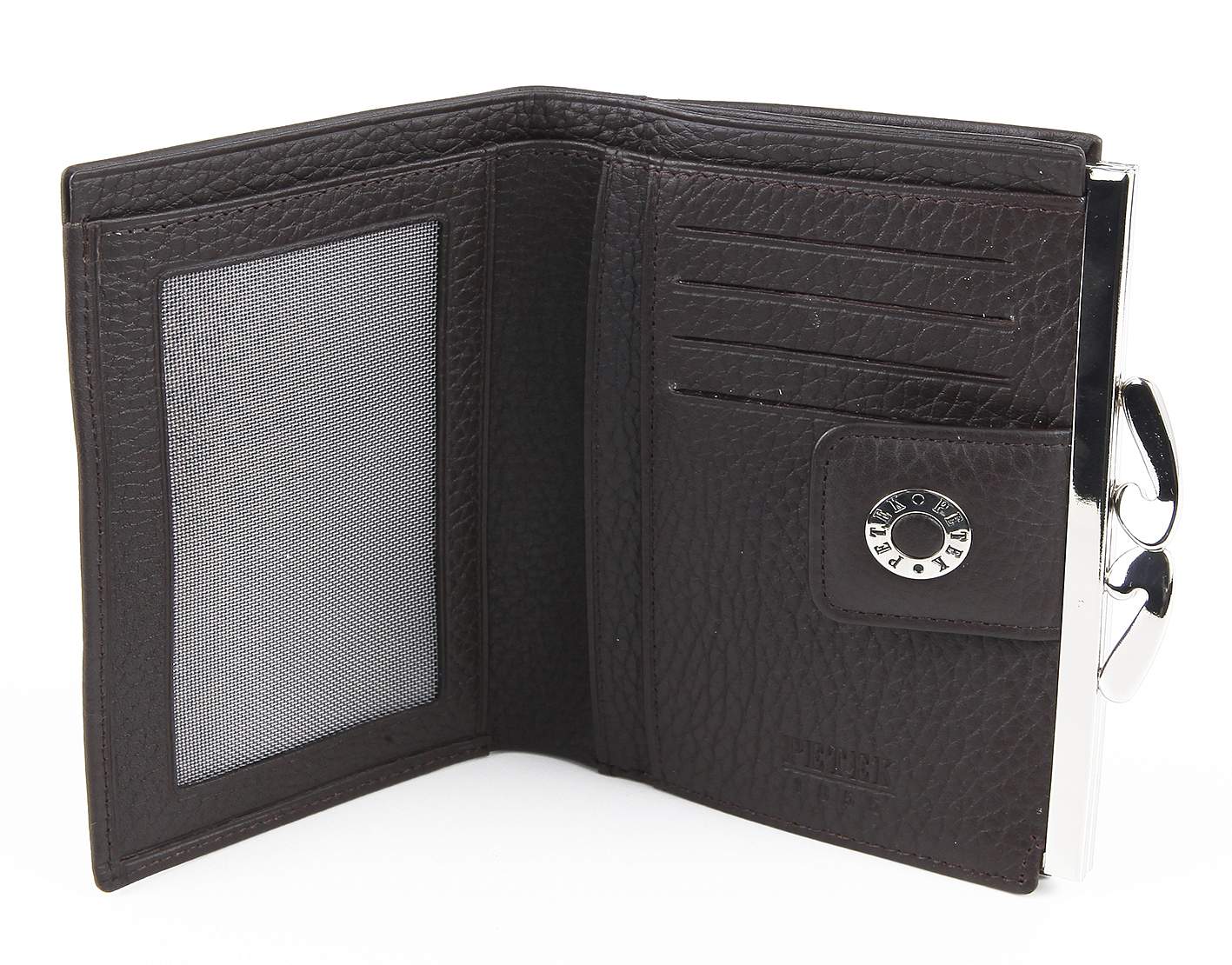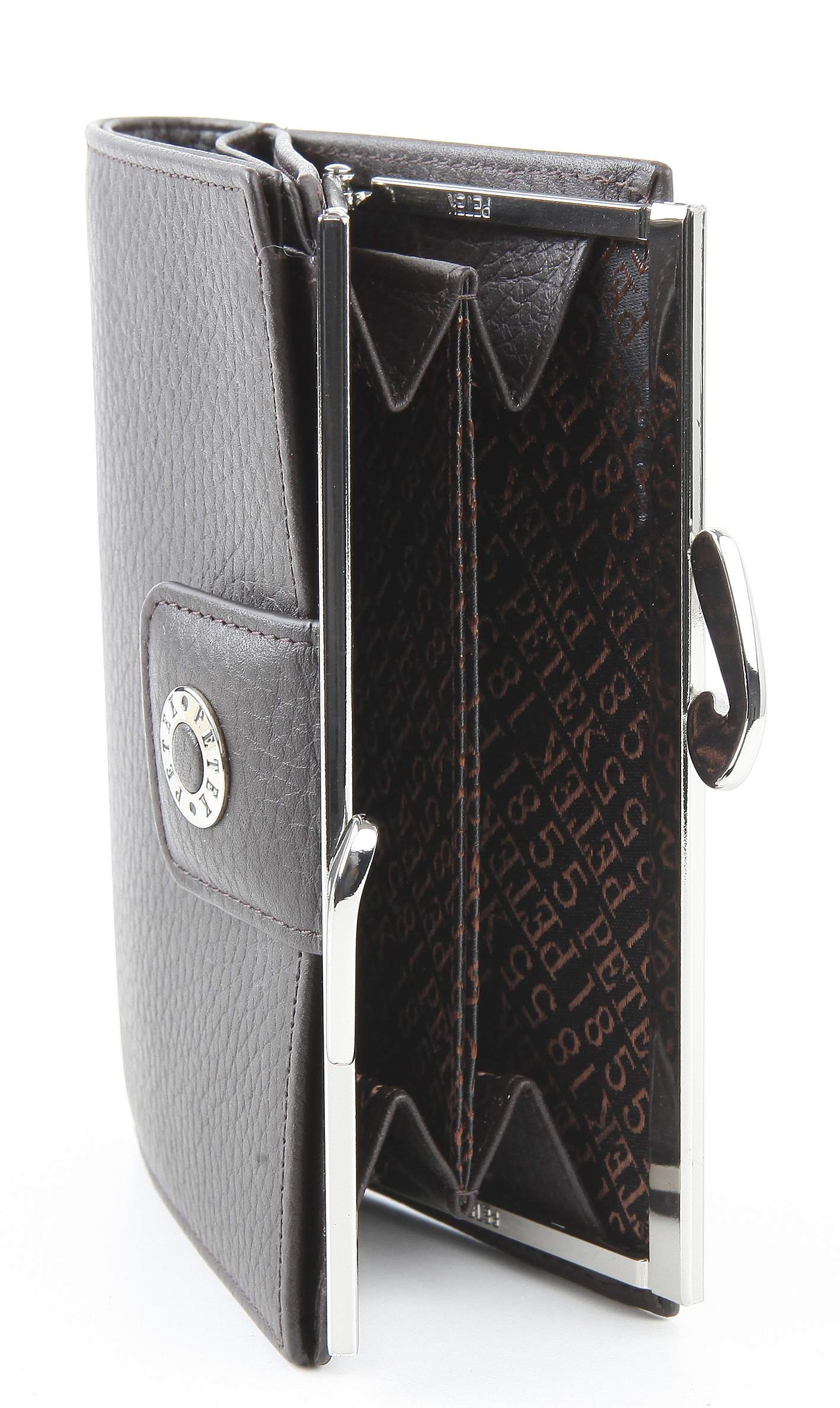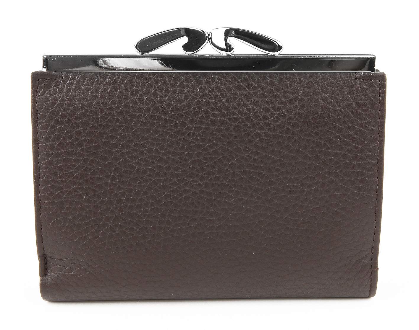 Кошелек. Раскладывается пополам, закрывается клапаном с кнопкой. Снаружи на задней стенке большая монетница из трех отделов (закрывается декоративным металлическим зажимом). Внутри: два отдела для купюр, два кармана для документов.