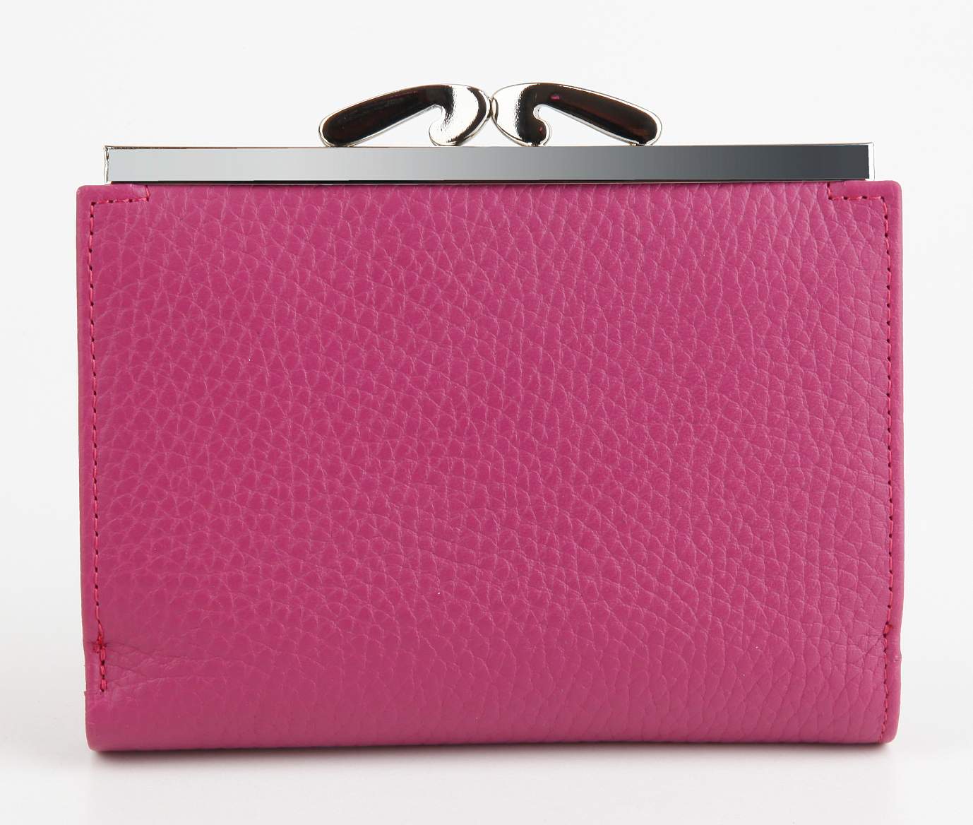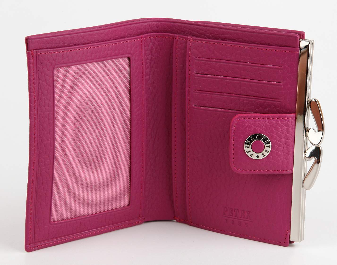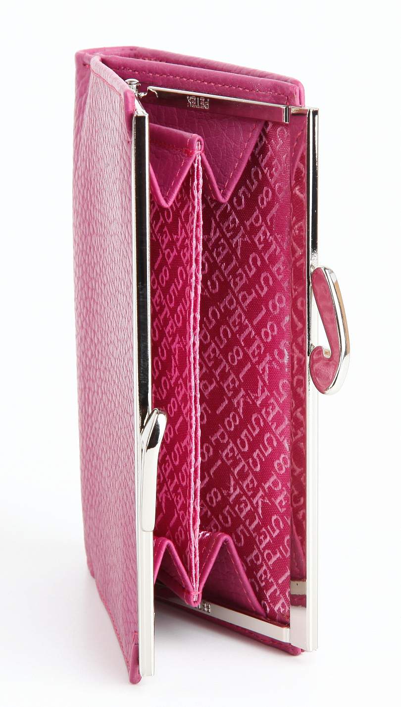 Кошелек. Раскладывается пополам, закрывается клапаном с кнопкой. Снаружи на задней стенке большая монетница из трех отделов (закрывается декоративным металлическим зажимом). Внутри: два отдела для купюр, два кармана для документов.