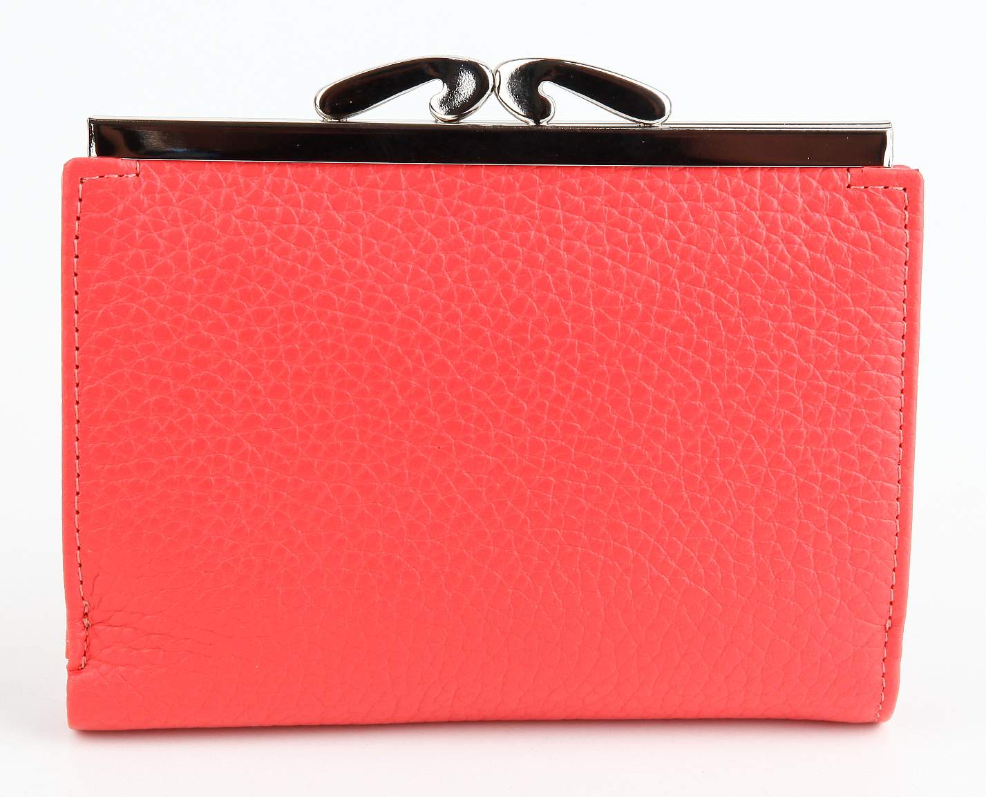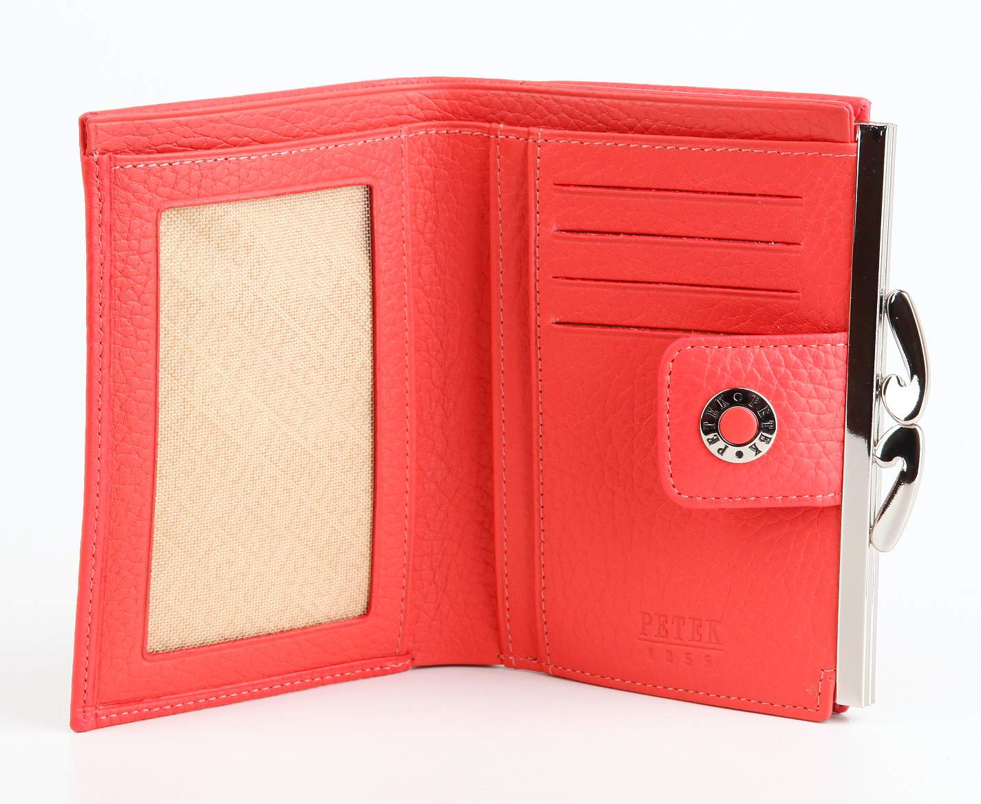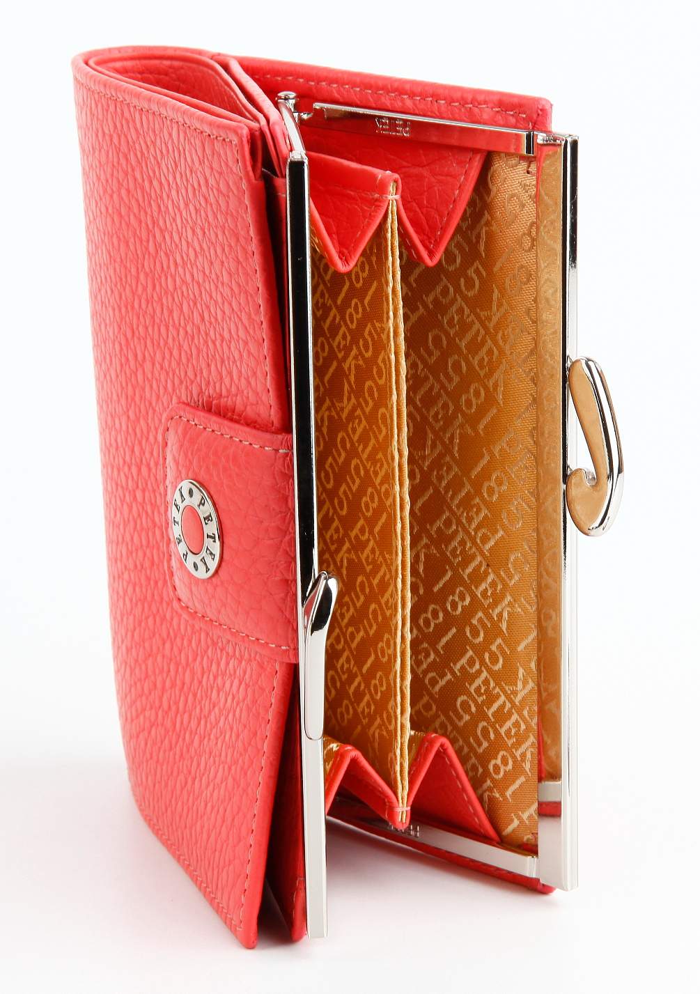 Кошелек. Раскладывается пополам, закрывается клапаном с кнопкой. Снаружи на задней стенке большая монетница из трех отделов (закрывается декоративным металлическим зажимом). Внутри: два отдела для купюр, два кармана для документов.