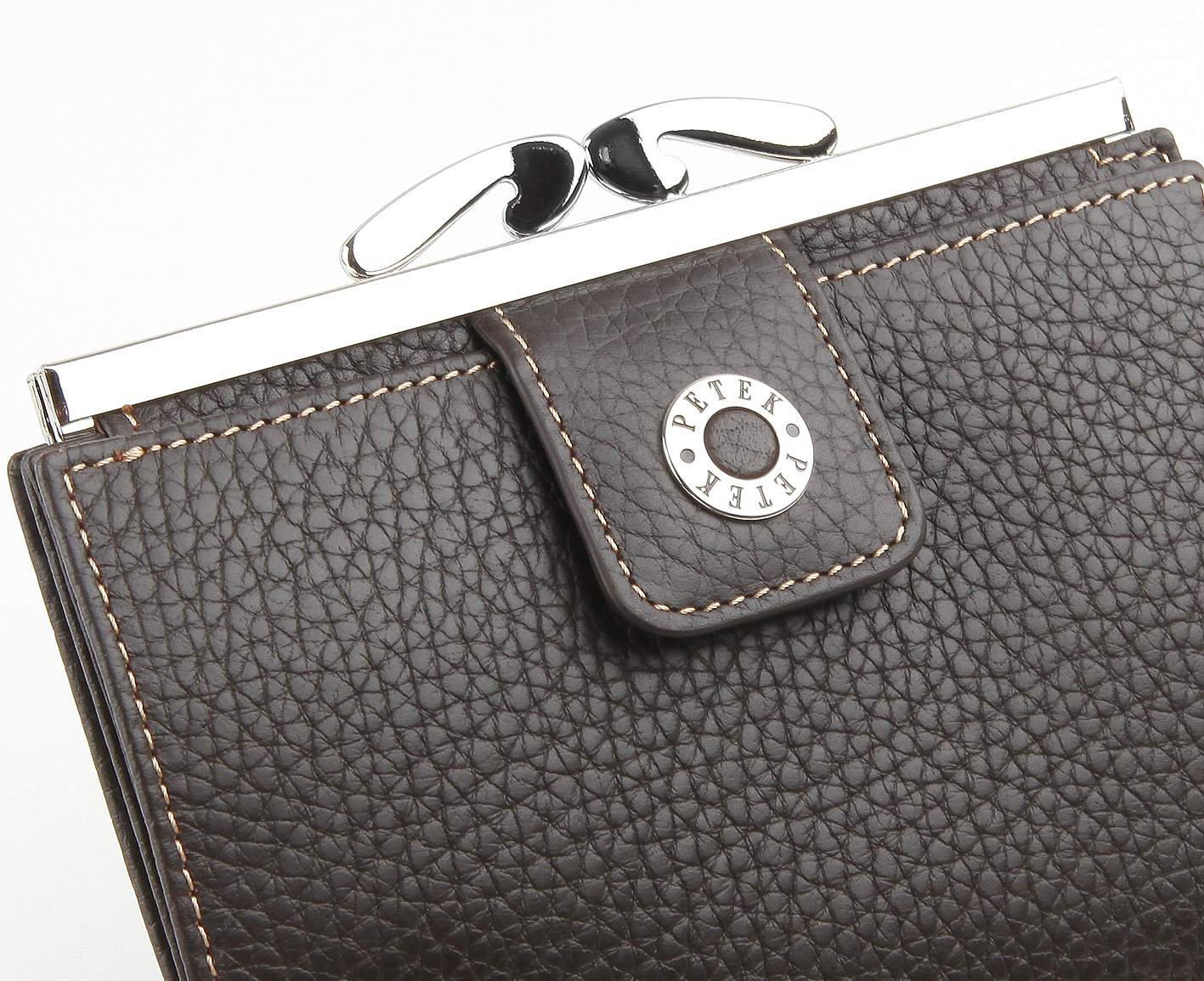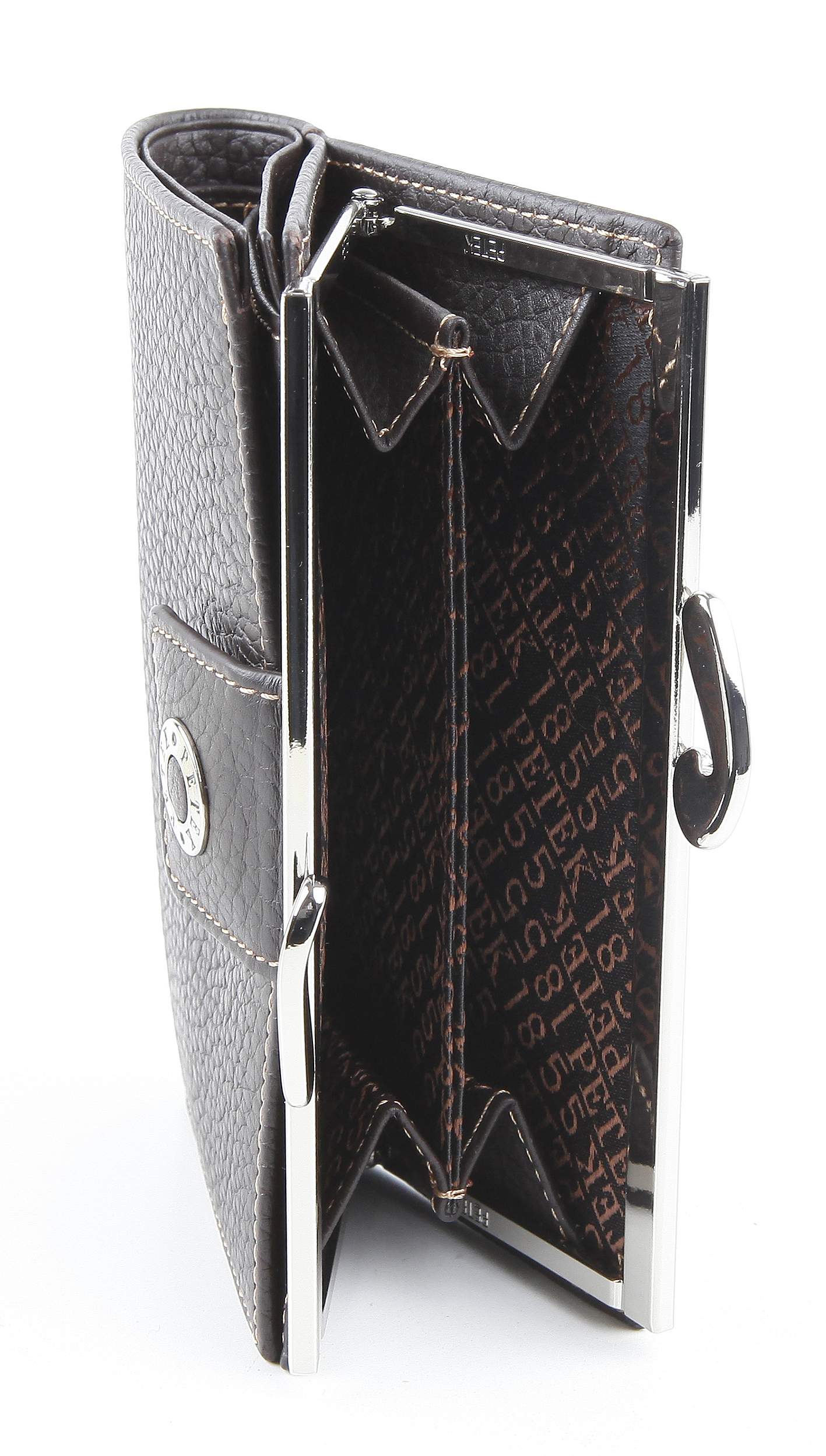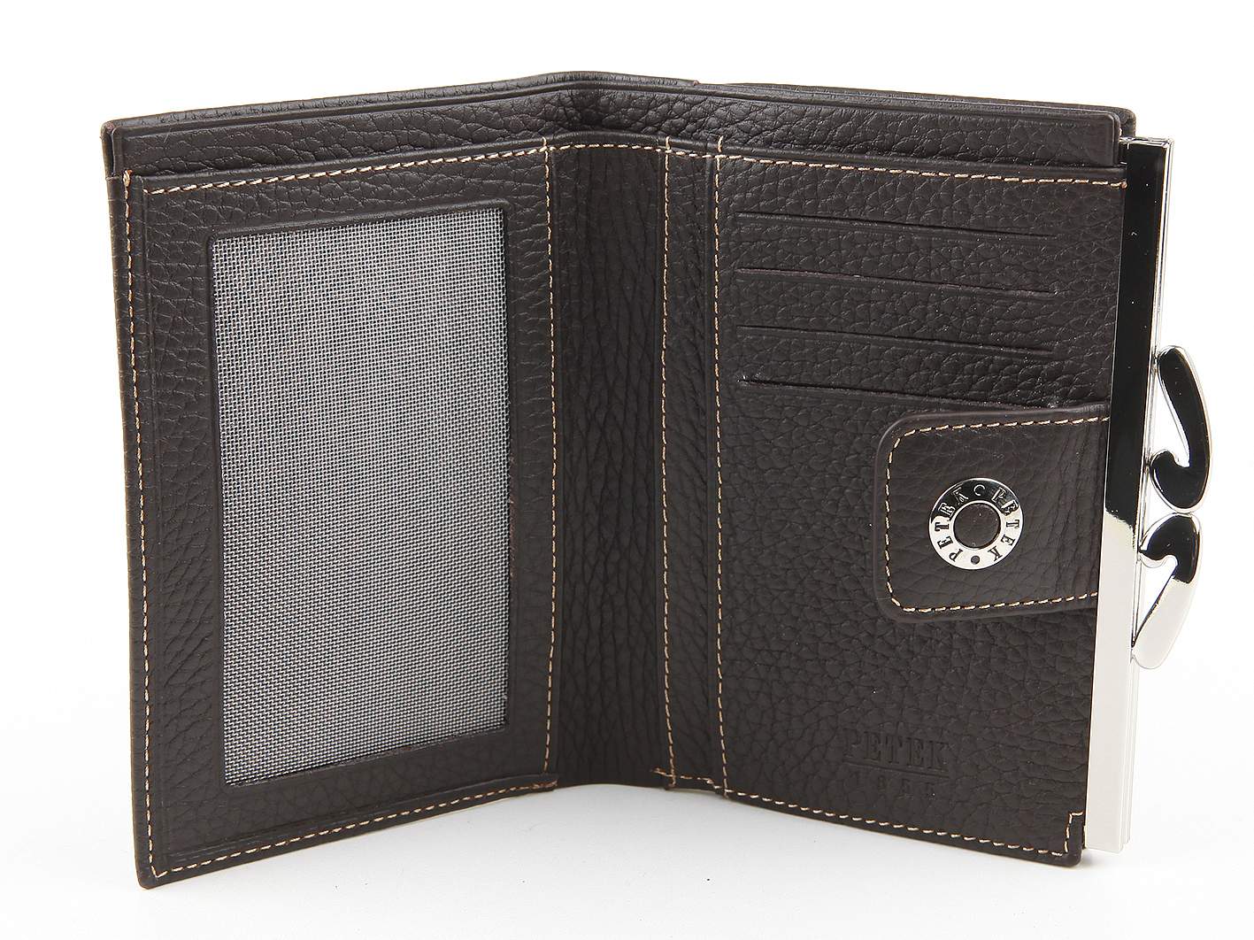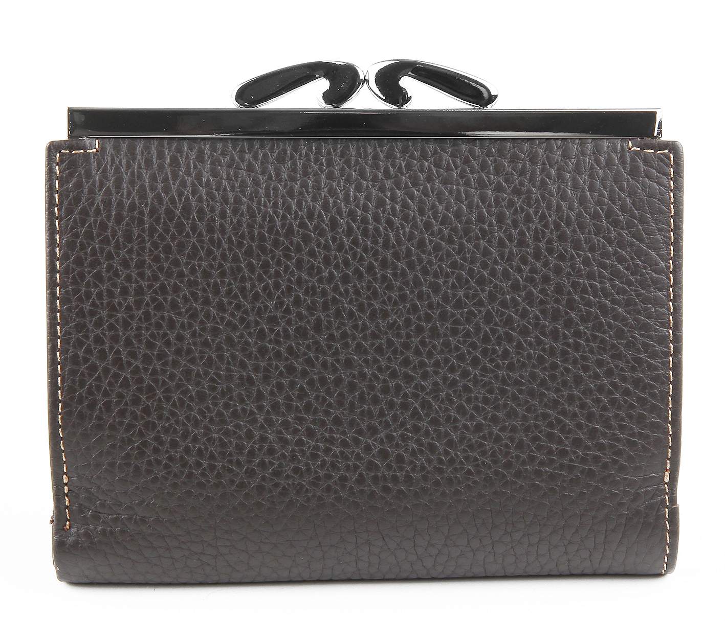 Кошелек. Раскладывается пополам, закрывается клапаном с кнопкой. Снаружи на задней стенке большая монетница из трех отделов (закрывается декоративным металлическим зажимом). Внутри: два отдела для купюр, два кармана для документов.