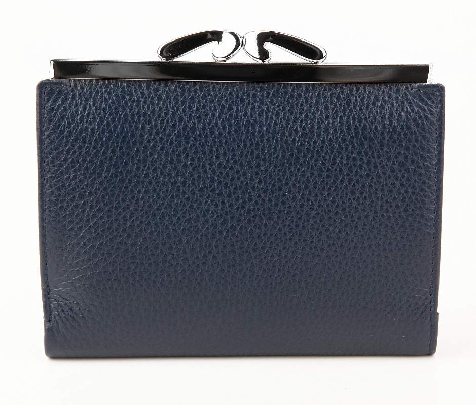 Кошелек. Раскладывается пополам, закрывается клапаном с кнопкой. Снаружи на задней стенке большая монетница из трех отделов (закрывается декоративным металлическим зажимом). Внутри: два отдела для купюр, два кармана для документов.