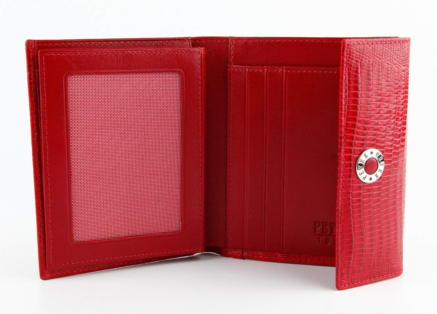 Женский элегантный кошелек Petek из натуральной кожи. Эта удобная и многофункциональная модель состоит из 1 отделения для купюр, 9 отделений для пластиковых карт, 5 карманов, 1 прозрачного отделения-сетки, с обратной стороны большая монетница на кнопке.