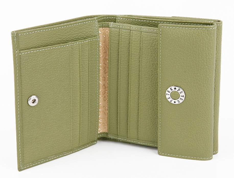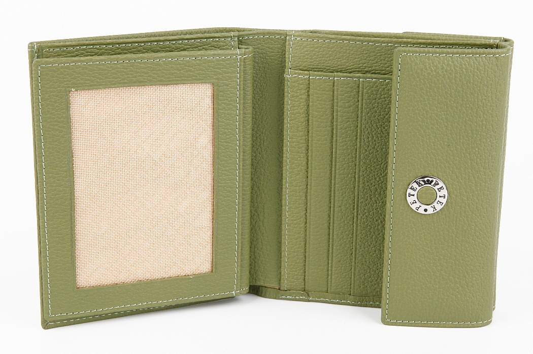 Женский элегантный кошелек Petek из натуральной кожи. Эта удобная и многофункциональная модель состоит из 1 отделения для купюр, 9 отделений для пластиковых карт, 5 карманов, 1 прозрачного отделения-сетки, с обратной стороны большая монетница на кнопке.