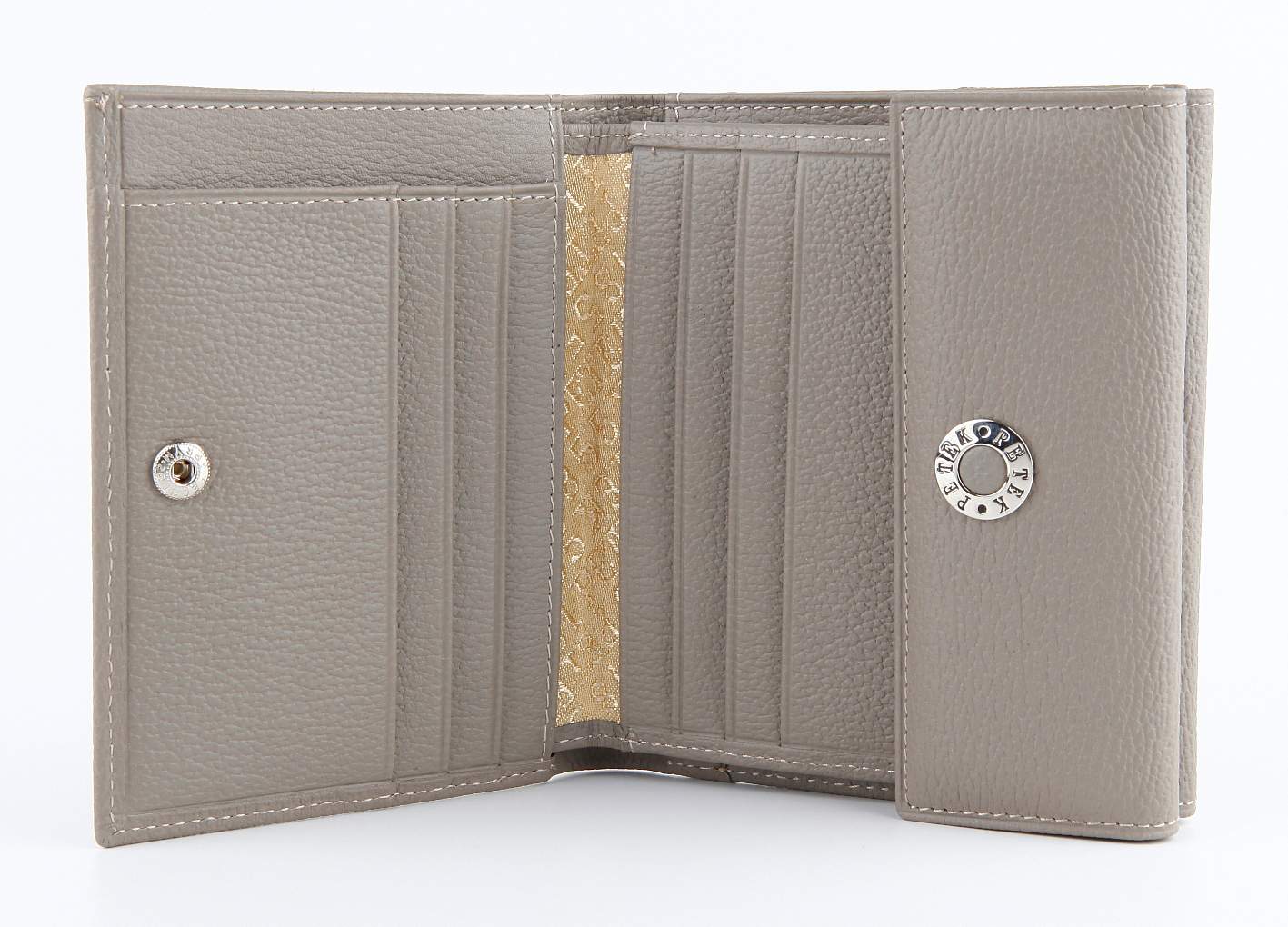 Женский элегантный кошелек Petek из натуральной кожи. Эта удобная и многофункциональная модель состоит из 1 отделения для купюр, 9 отделений для пластиковых карт, 5 карманов, 1 прозрачного отделения-сетки, с обратной стороны большая монетница на кнопке.