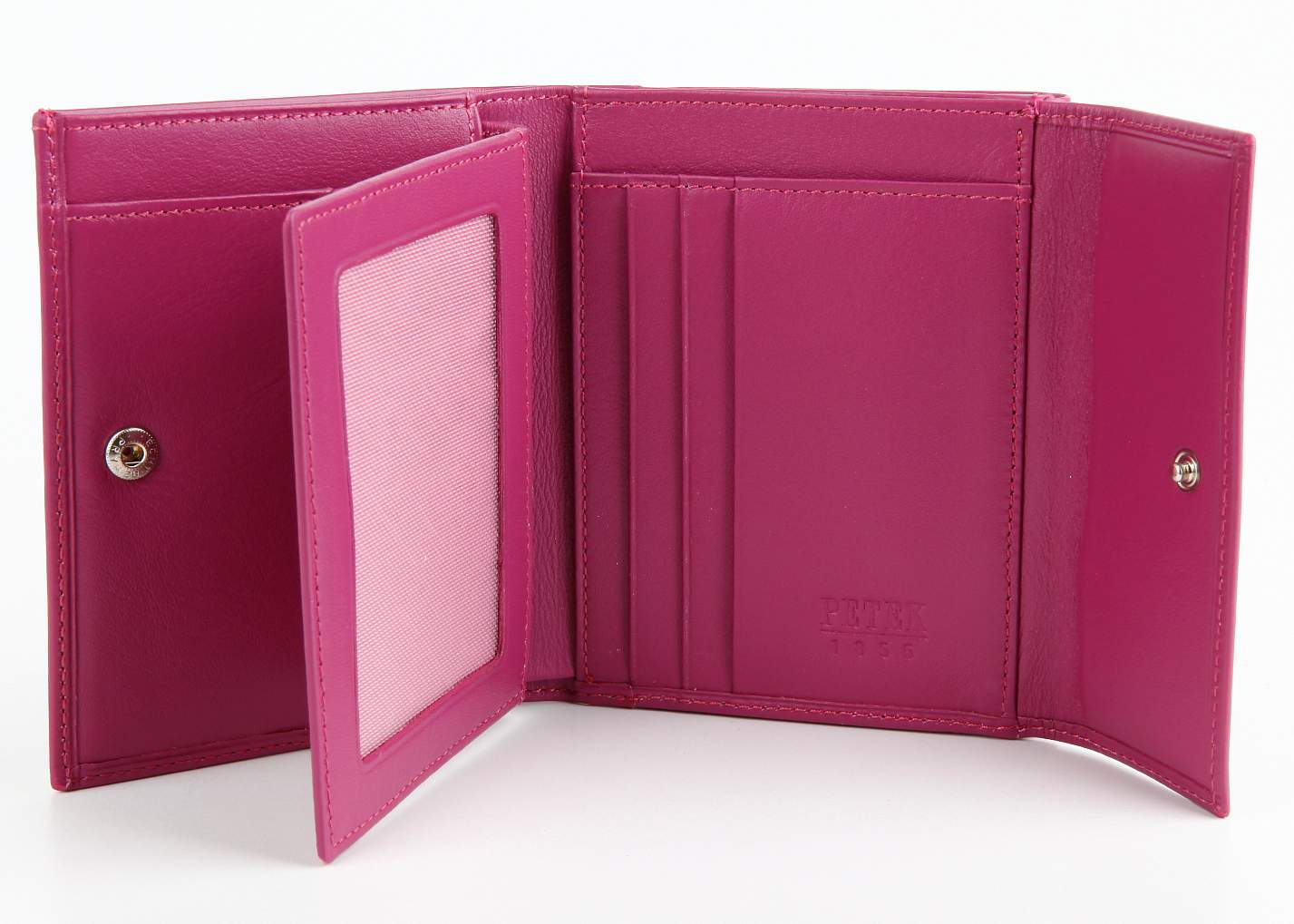 Женский элегантный кошелек Petek из натуральной кожи. Эта удобная и многофункциональная модель состоит из 1 отделения для купюр, 9 отделений для пластиковых карт, 5 карманов, 1 прозрачного отделения-сетки, с обратной стороны большая монетница на кнопке.