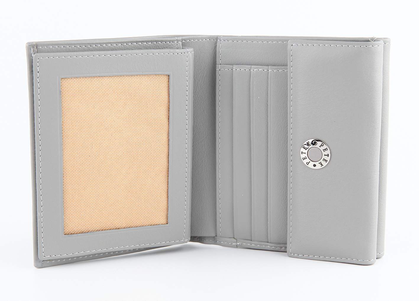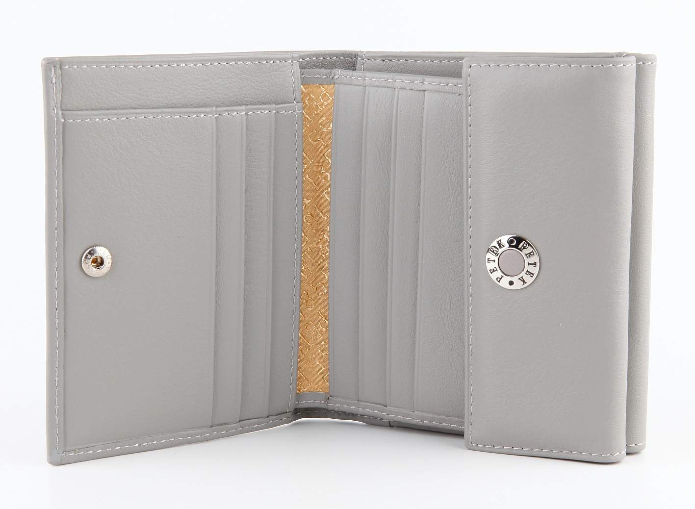 Женский элегантный кошелек Petek из натуральной кожи. Эта удобная и многофункциональная модель состоит из 1 отделения для купюр, 9 отделений для пластиковых карт, 5 карманов, 1 прозрачного отделения-сетки, с обратной стороны большая монетница на кнопке.