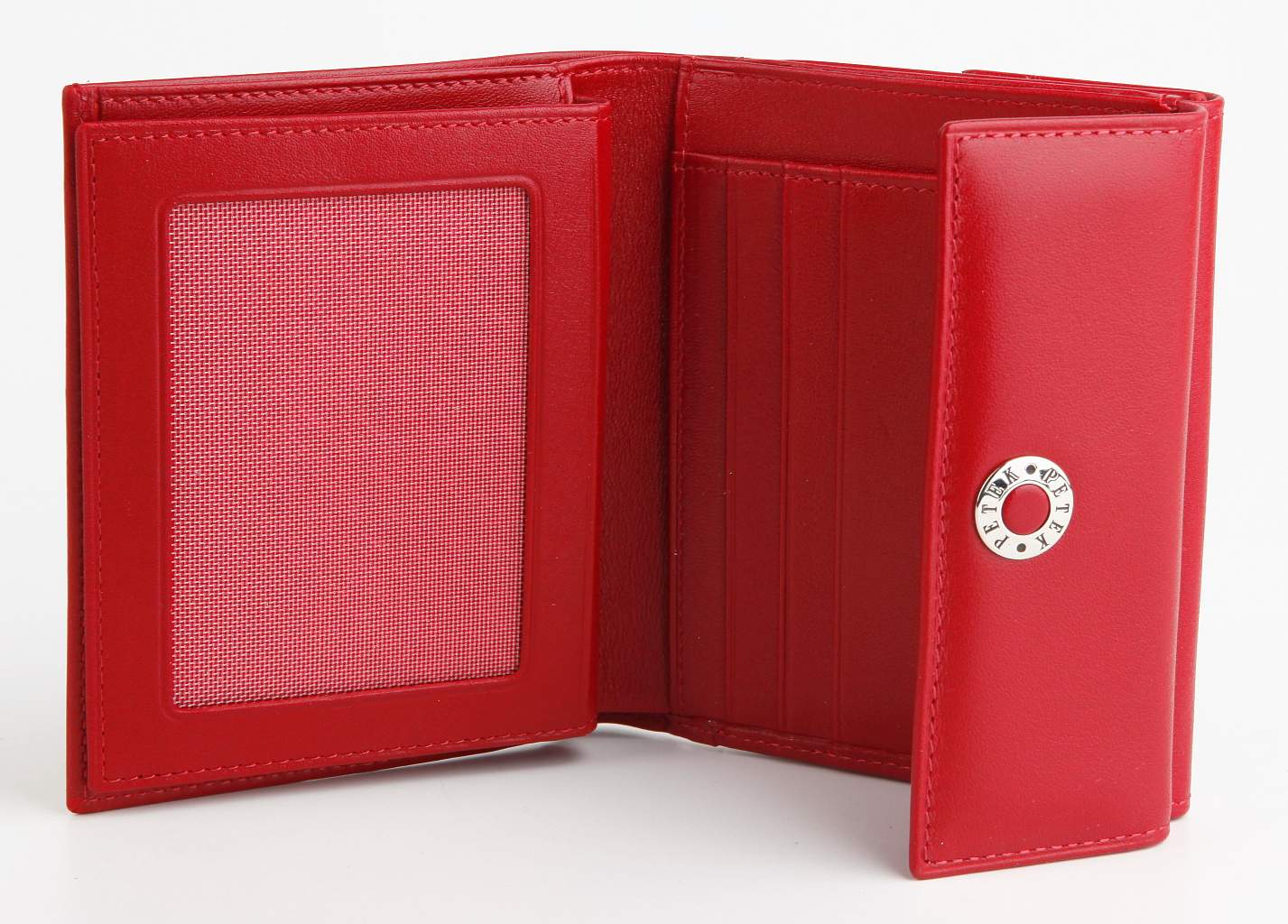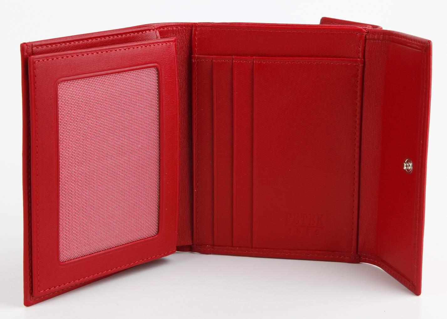 Женский элегантный кошелек Petek из натуральной кожи. Эта удобная и многофункциональная модель состоит из 1 отделения для купюр, 9 отделений для пластиковых карт, 5 карманов, 1 прозрачного отделения-сетки, с обратной стороны большая монетница на кнопке.