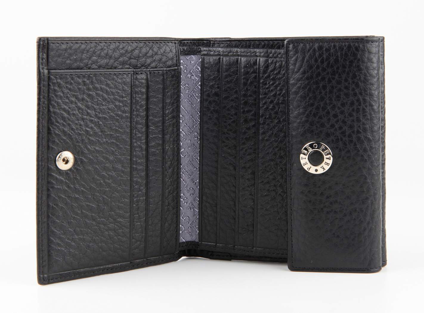 Женский элегантный кошелек Petek из натуральной кожи. Эта удобная и многофункциональная модель состоит из 1 отделения для купюр, 9 отделений для пластиковых карт, 5 карманов, 1 прозрачного отделения-сетки, с обратной стороны большая монетница на кнопке.