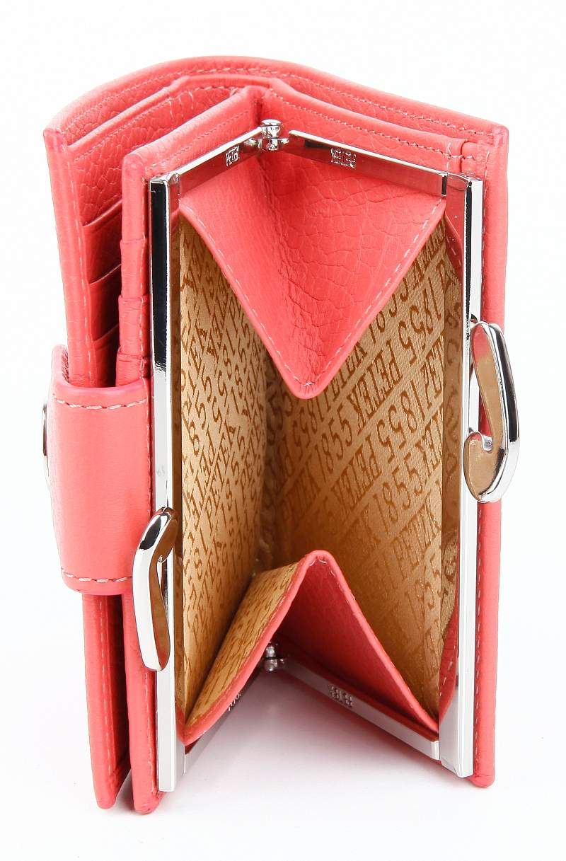 Кошелек. Раскладывается пополам, закрывается на кнопку, внутри: два больших отдела для купюр, отделение для мелочи с классическим зажимом, три потайных кармана для документов, пять отделений для карт, один карман для документов в сеточку.