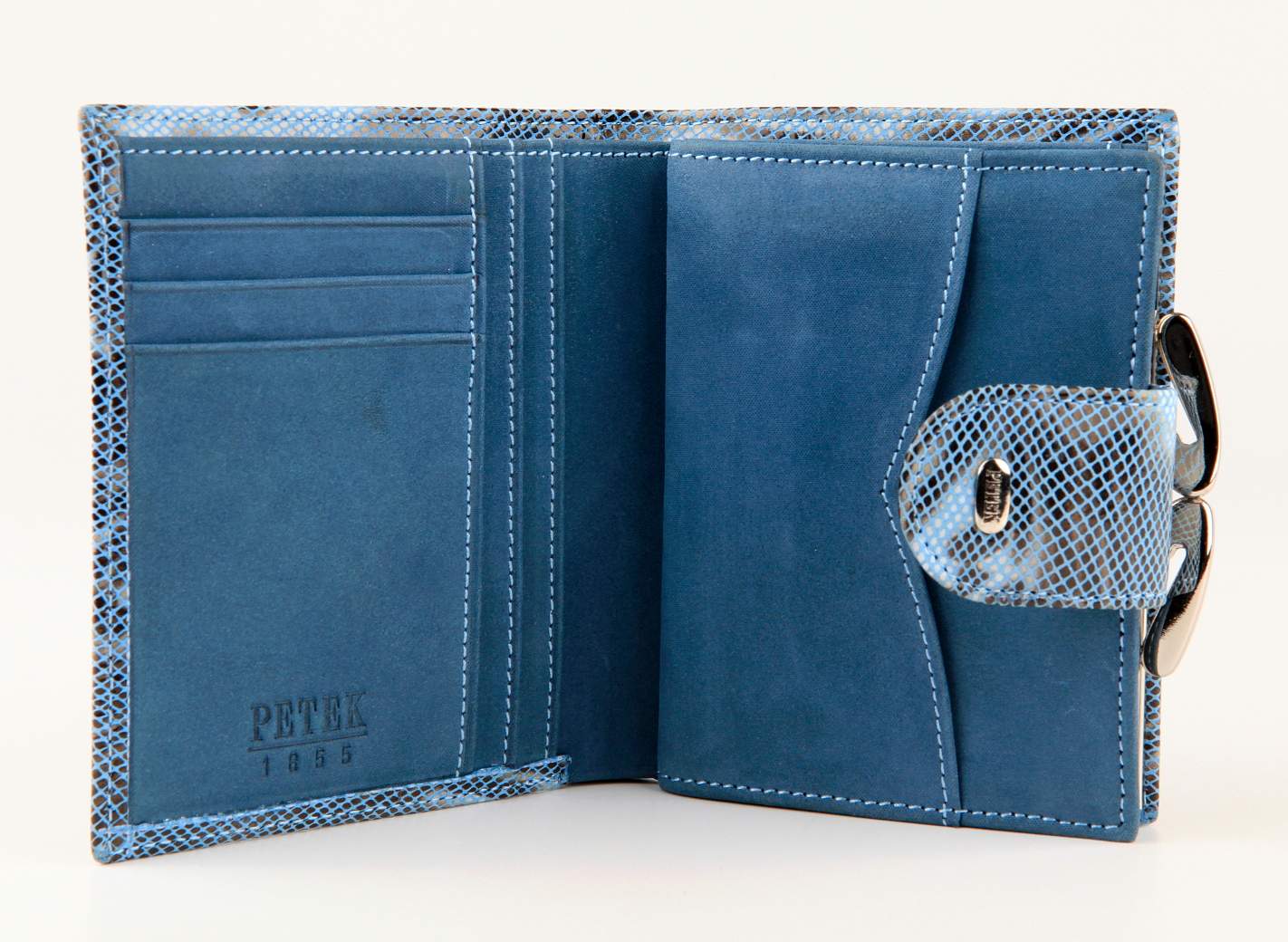 Кошелек. Раскладывается пополам, закрывается на кнопку, внутри: два больших отдела для купюр, отделение для мелочи с классическим зажимом (внутри - два отдела), три отделений для карт, три потайных кармана для документов.