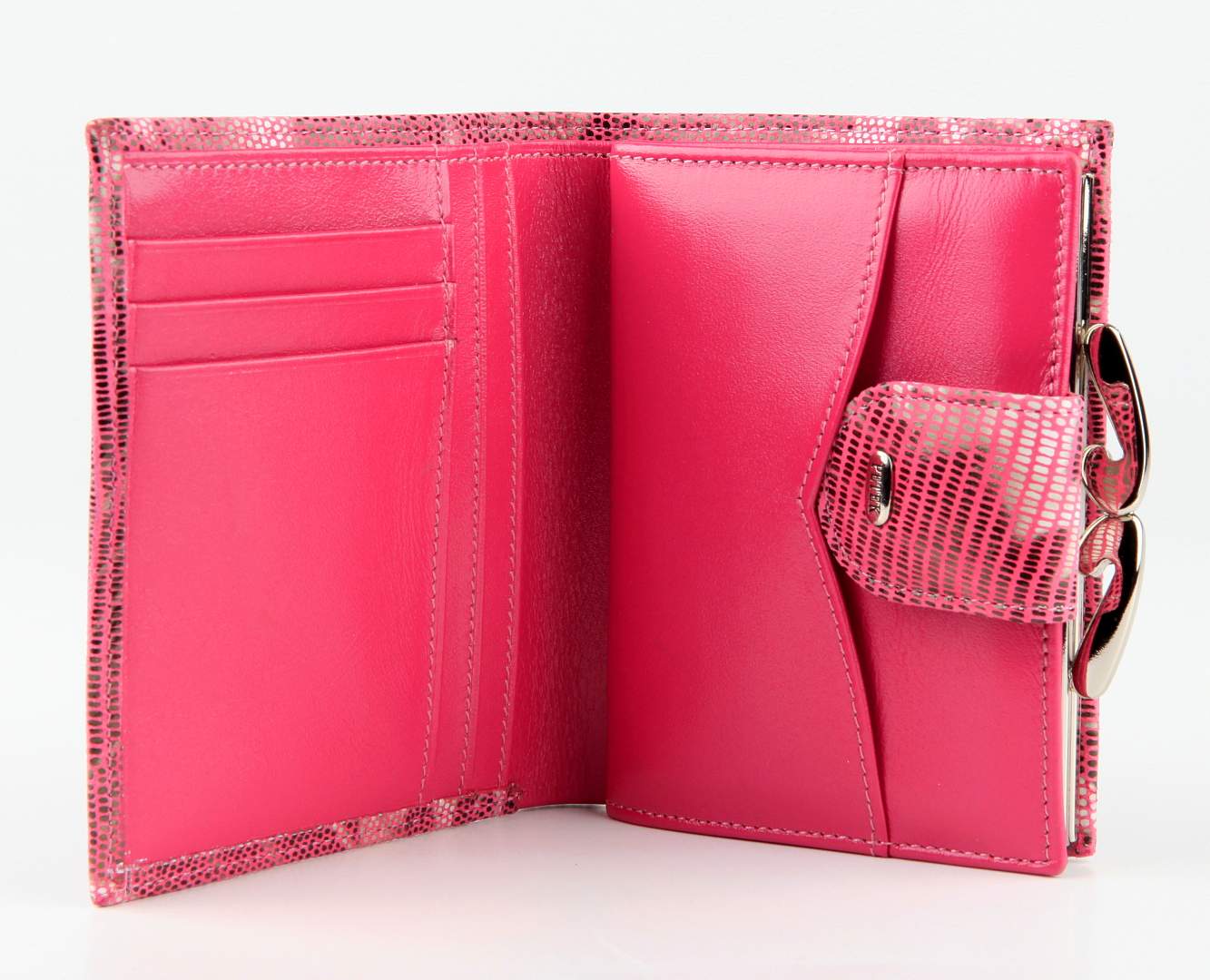 Кошелек. Раскладывается пополам, закрывается на кнопку, внутри: два больших отдела для купюр, отделение для мелочи с классическим зажимом (внутри - два отдела), три отделений для карт, три потайных кармана для документов.