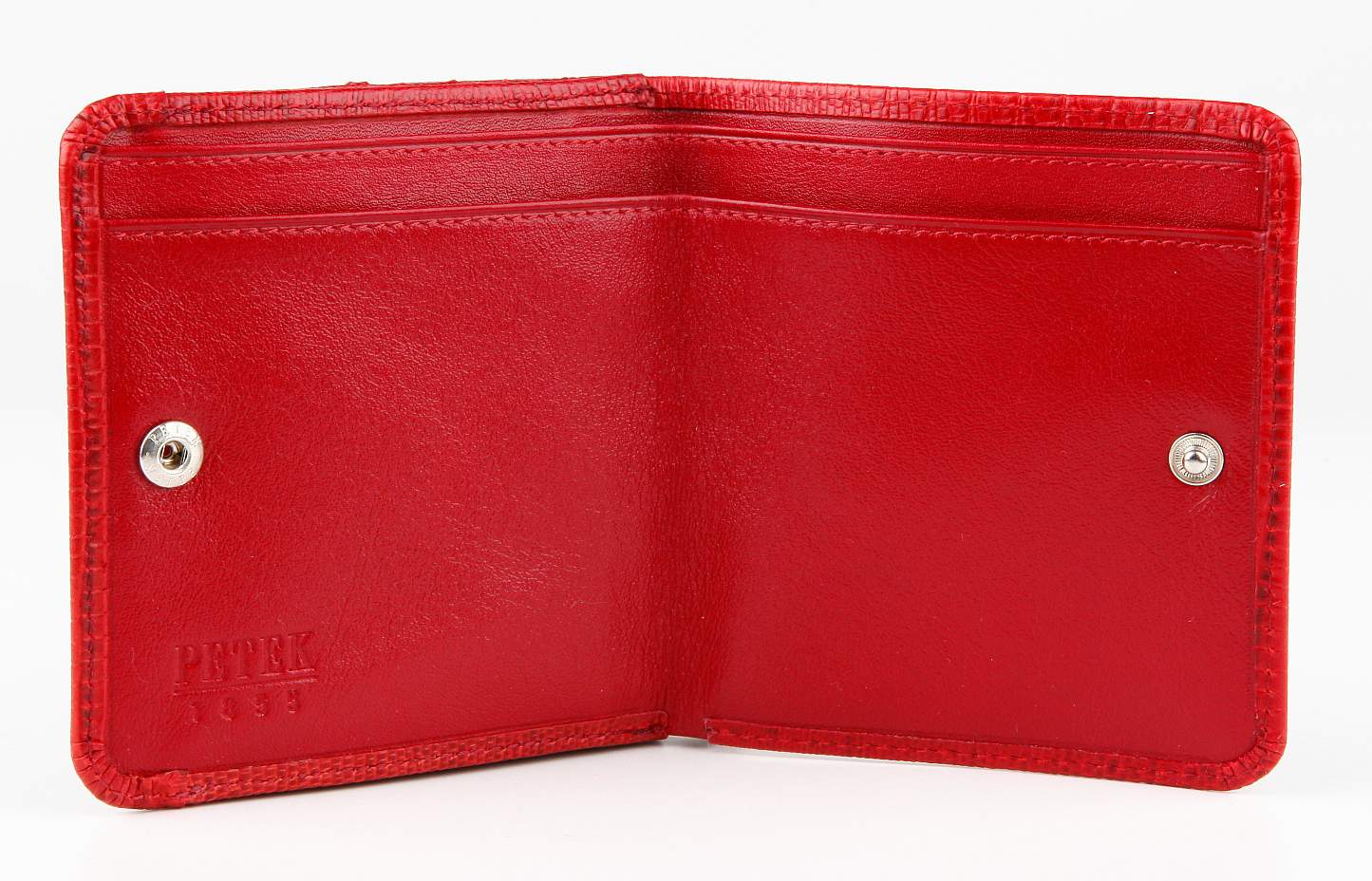 Мужское портмоне Petek из натуральной кожи. Компактная небольшая модель, которая легко поместится в карман пиджака или брюк. Внутри: два отделения для купюр, отделение для монет. Портмоне закрывается на кнопку.