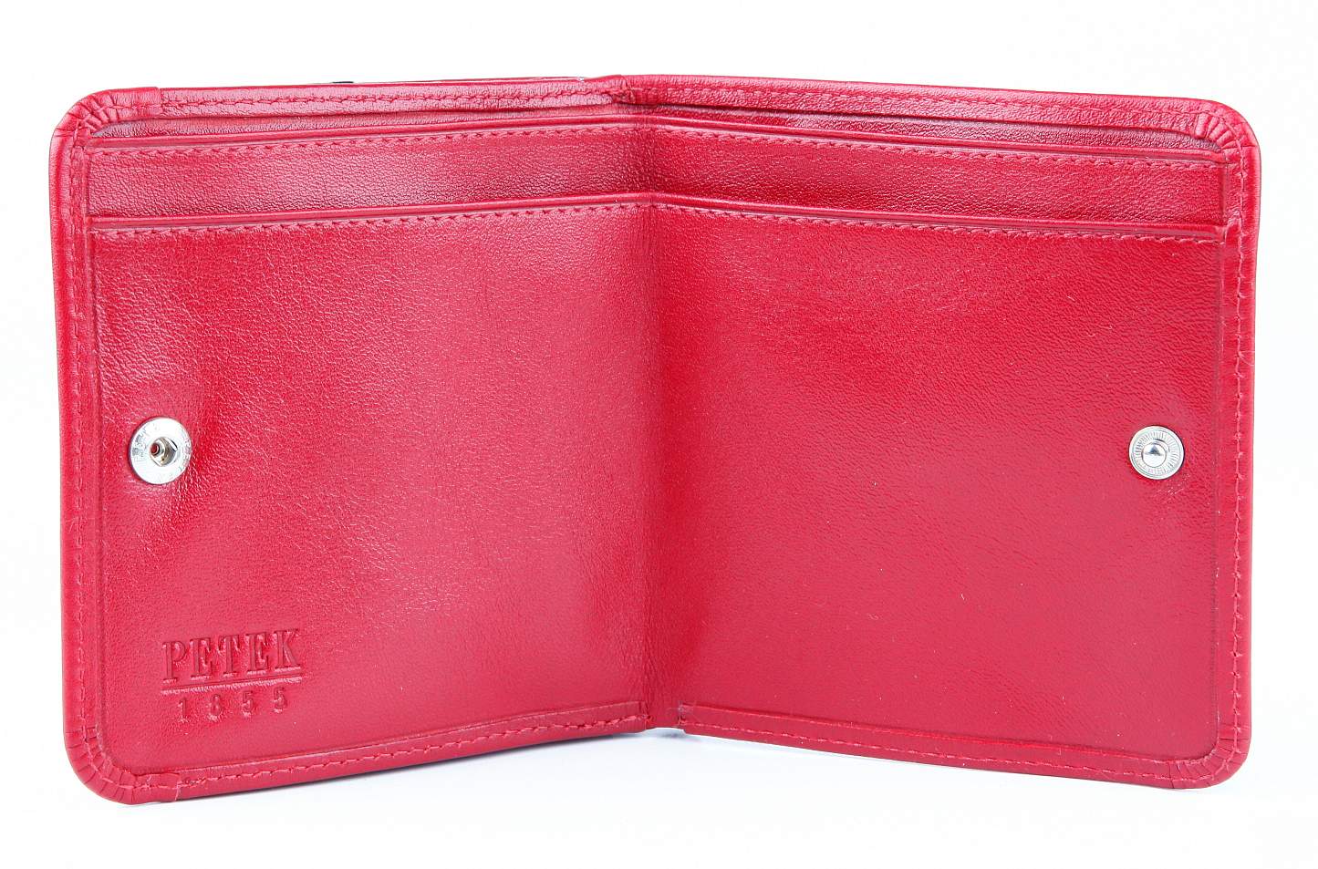 Мужское портмоне Petek из натуральной кожи. Компактная небольшая модель, которая легко поместится в карман пиджака или брюк. Внутри: два отделения для купюр, отделение для монет. Портмоне закрывается на кнопку.