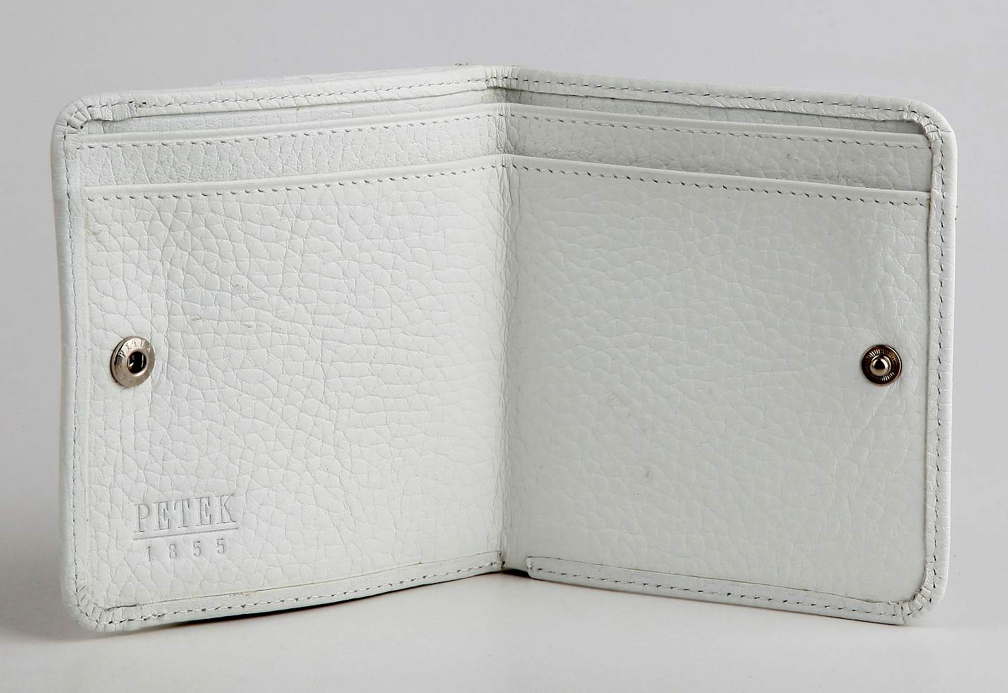 Мужское портмоне Petek из натуральной кожи. Компактная небольшая модель, которая легко поместится в карман пиджака или брюк. Внутри: два отделения для купюр, отделение для монет. Портмоне закрывается на кнопку.