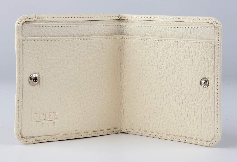 Мужское портмоне Petek из натуральной кожи. Компактная небольшая модель, которая легко поместится в карман пиджака или брюк. Внутри: два отделения для купюр, отделение для монет. Портмоне закрывается на кнопку.