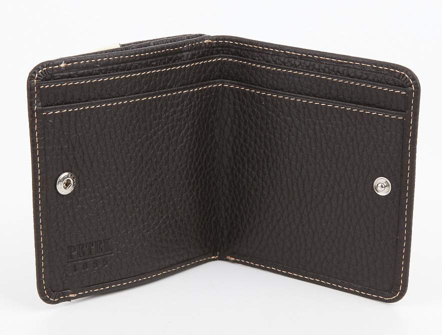 Мужское портмоне Petek из натуральной кожи. Компактная небольшая модель, которая легко поместится в карман пиджака или брюк. Внутри: два отделения для купюр, отделение для монет. Портмоне закрывается на кнопку.
