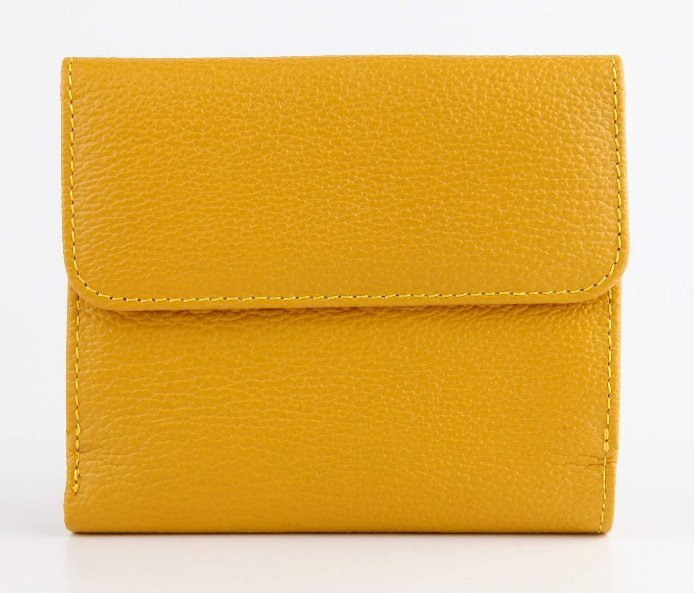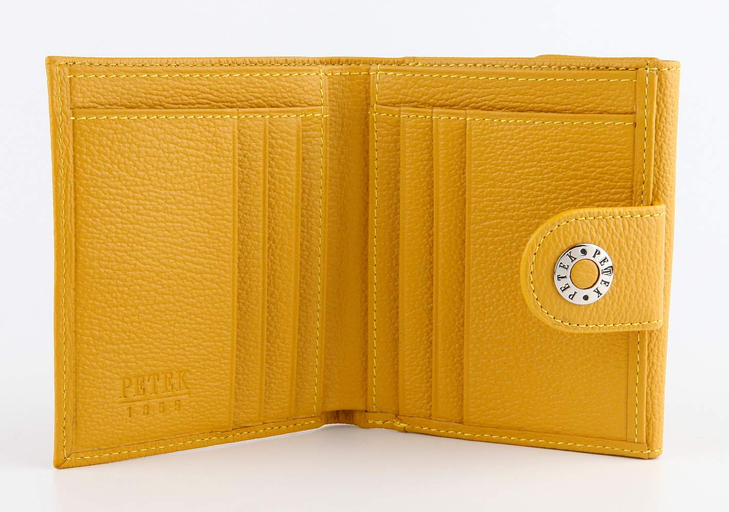Женское элегантное портмоне Petek из натуральной кожи желтого цвета с зернистой фактурой. Одно отделение для купюр, шесть отделений для кредитных карт, снаружи монетница на кнопке.